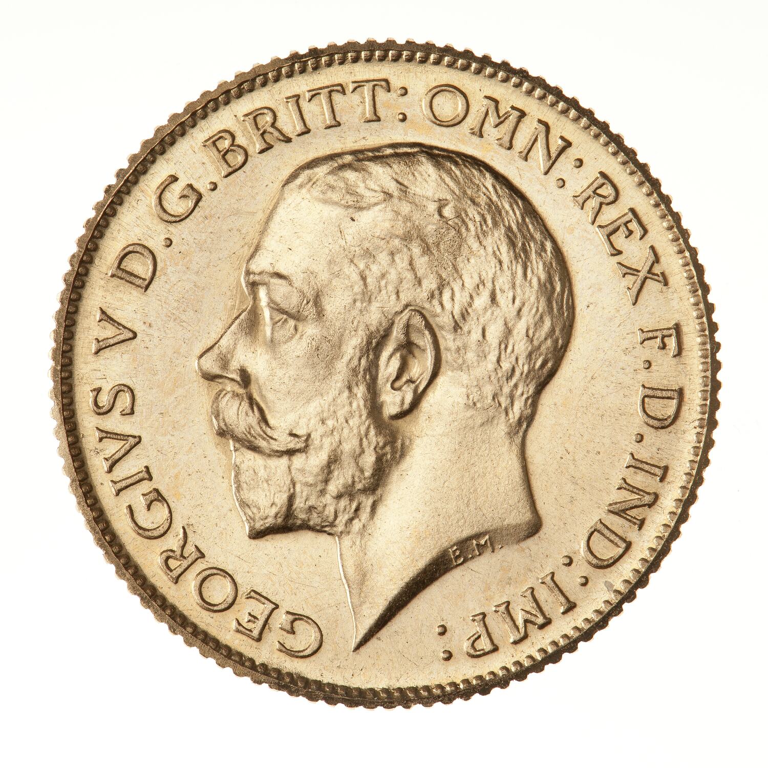 Bare head of George V facing left; around, GEORGIVS V D.G. BRITT: OMN: REX F:D: IND: IMP: