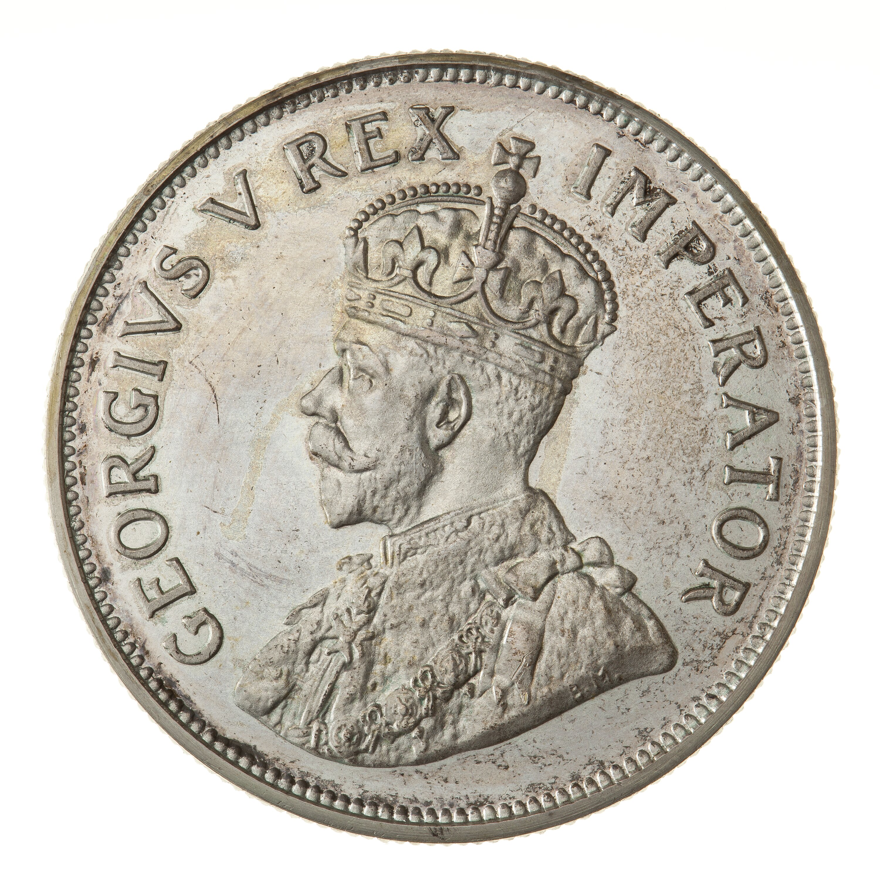 Crowned and draped bust of the King facing left, the King is wearing the Imperial Crown and the ermine Robe of State, the Collar of the Most Noble Order of the Garter, and the Badge of the Most Honourable Order of the Bath; around, GEORGIVS V REX IMPERATOR; on bust truncation, the artist's initials, BM