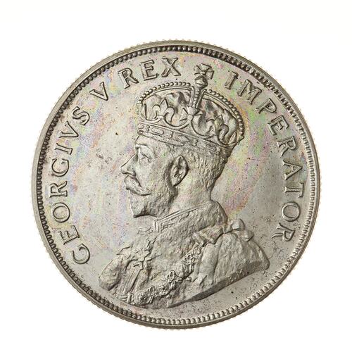 Crowned and draped bust of the King facing left, the King is wearing the Imperial Crown and the ermine Robe of State, the Collar of the Most Noble Order of the Garter, and the Badge of the Most Honourable Order of the Bath; around, GEORGIVS V REX IMPERATOR; on bust truncation, the artist's initials, BM