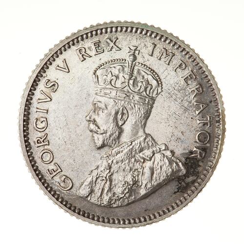 Crowned and draped bust of the King facing left, the King is wearing the Imperial Crown and the ermine Robe of State, the Collar of the Most Noble Order of the Garter, and the Badge of the Most Honourable Order of the Bath; around, GEORGIVS V REX IMPERATOR; on bust truncation, the artist's initials, BM
