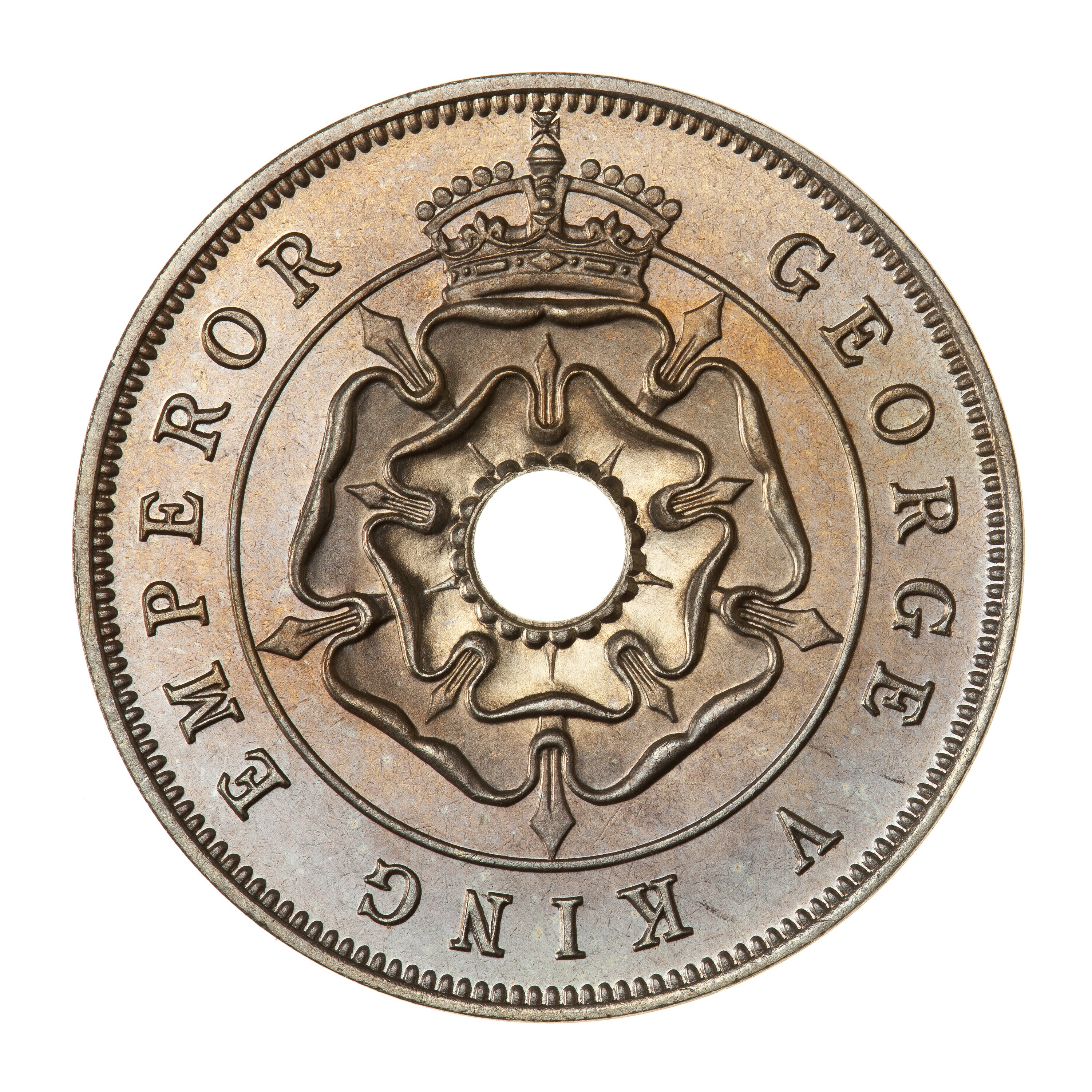 Around hole, a crowned rose; around, GEORGE V KING EMPEROR
