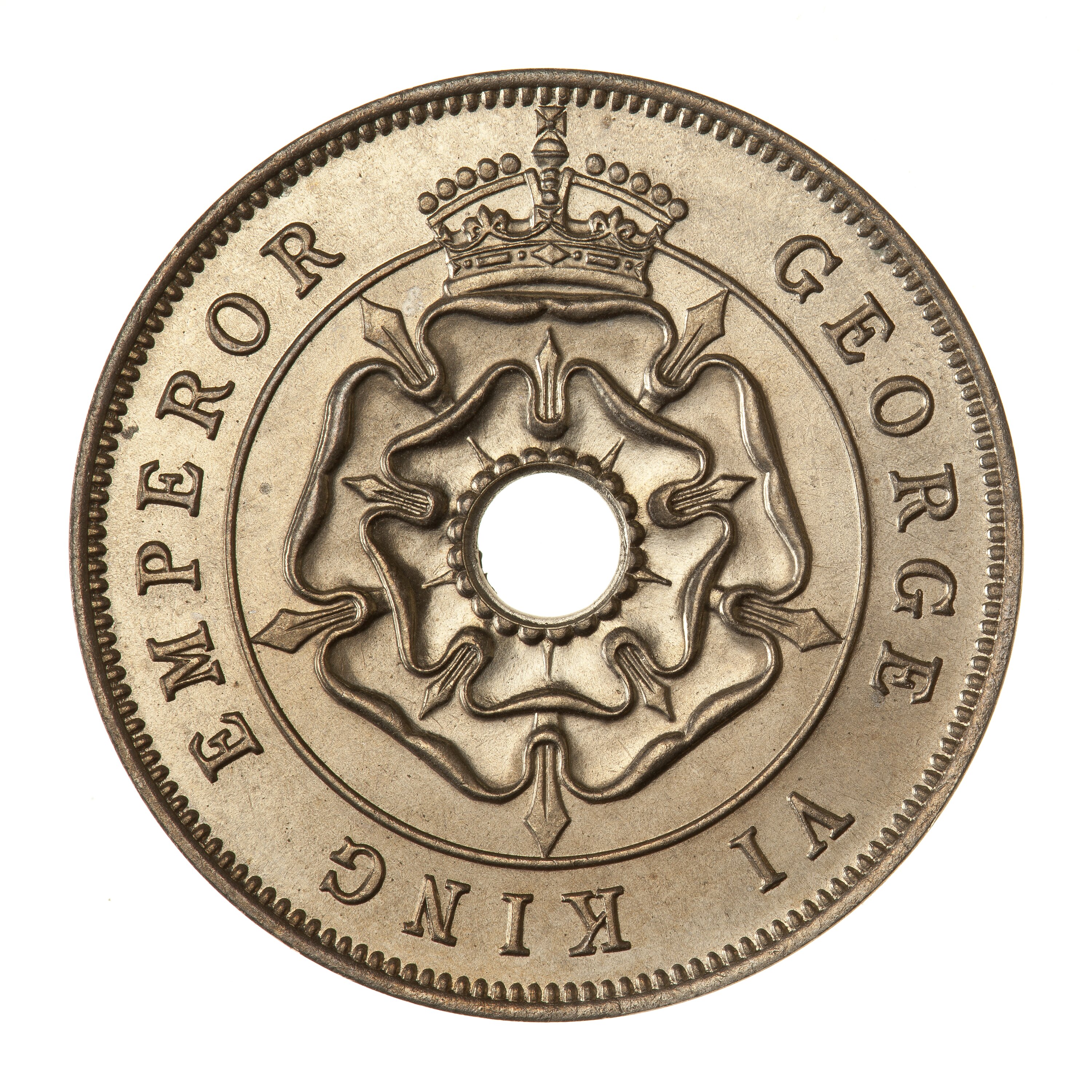 Around hole, a crowned rose; around, GEORGE VI KING EMPEROR