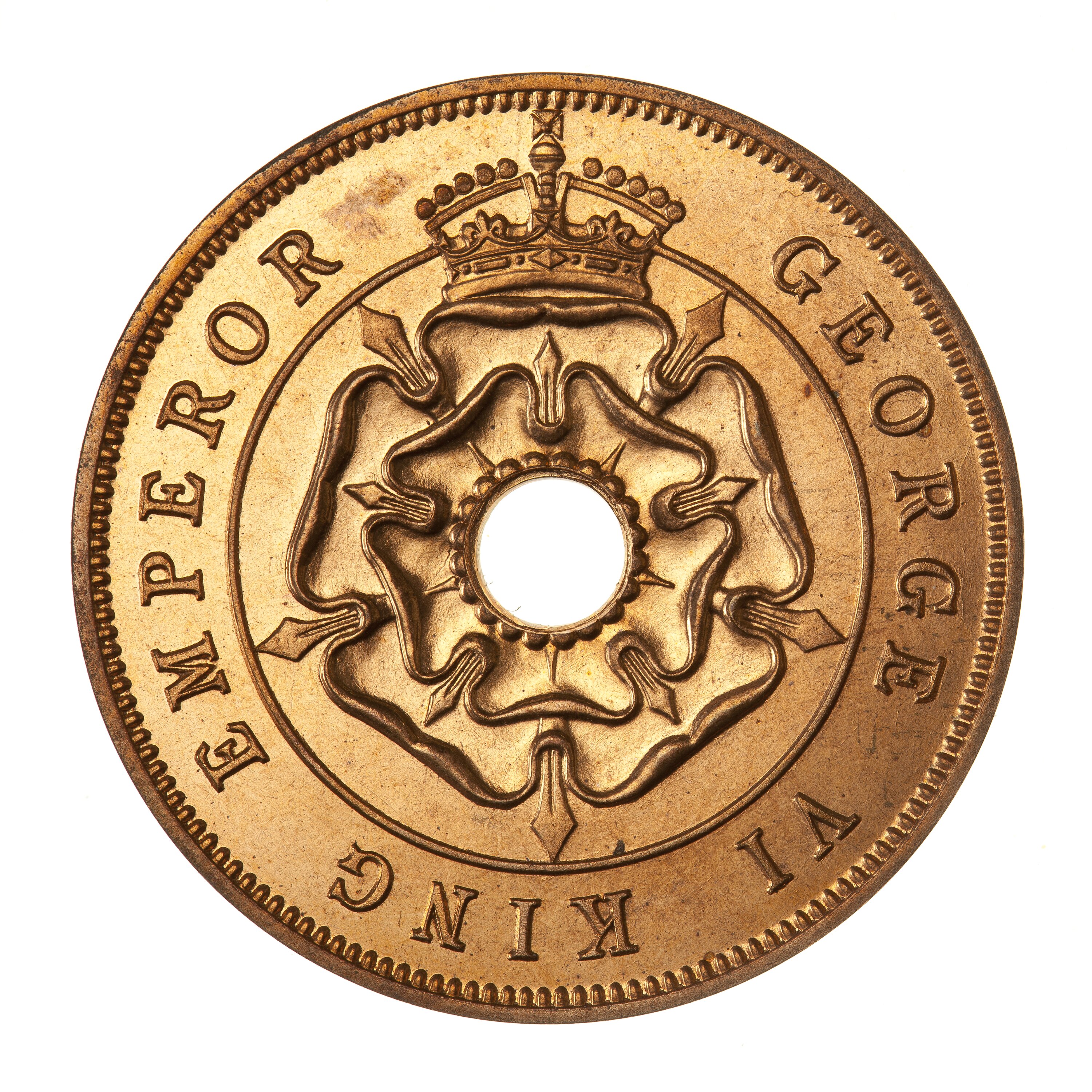 Around hole, a crowned rose; around, GEORGE VI KING EMPEROR