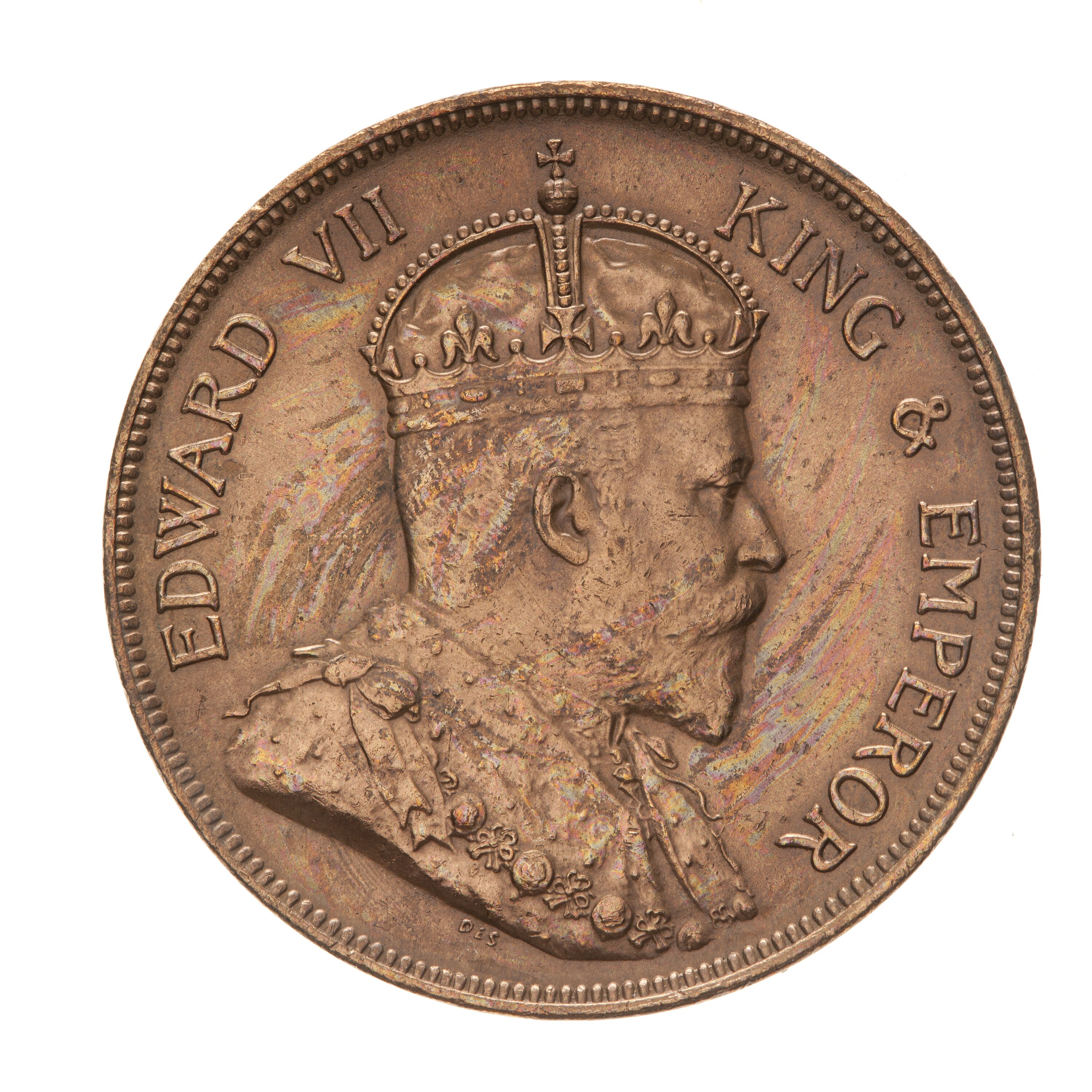Crowned and draped bust of the King facing right, the King is wearing the Imperial Crown and the ermine Robe of State, the Collar of the Most Honourable Order of the Bath; around, EDWARD VII KING & EMPEROR; below the bust truncation, the artist's initials, DES