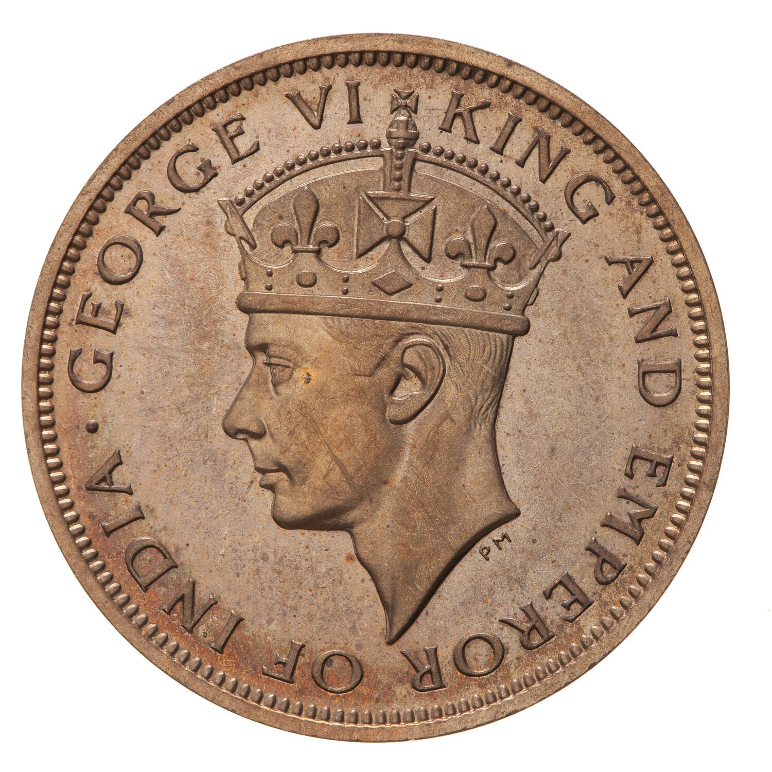 Crowned head of the King facing left; around, GOERGE VI KING AND EMPEROR OF INDIA; below the neck truccation in small letters the artist's initials, PM