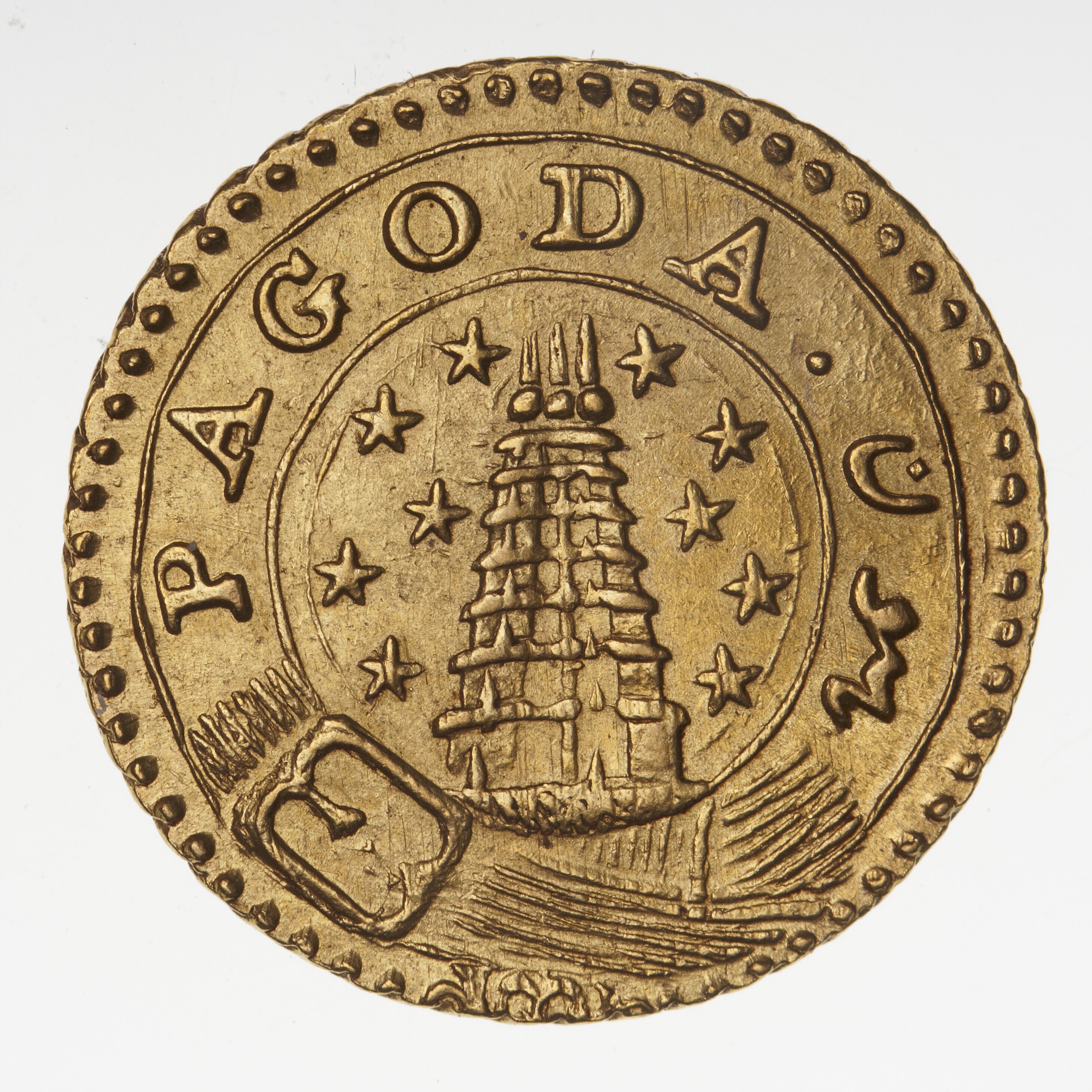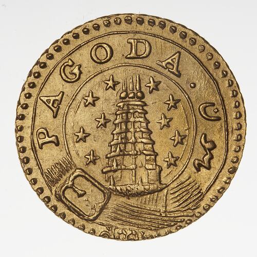 On 2 February 1808 a proclamation announced the the dumpy form star pagoda was to be replaced by new one and two pagoda pieces struck with flat surfaces like the silver coins introduced in 1807. The new designs were introduced from April 1808 with production continuing until 1816. 1,381,809 of the 1 pagoda denomination were struck during that period.