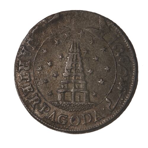 Silver coins struck on the pagoda standard were authorised in July 1807. The coins were struck from silver obtained from Spanish dollars. In 1808 the dumpy style gold star pagoda was replaced by flat European style gold coins and this initial series of silver pagodas was re-designed to closer match the new gold pieces.