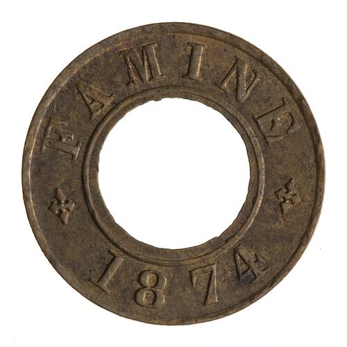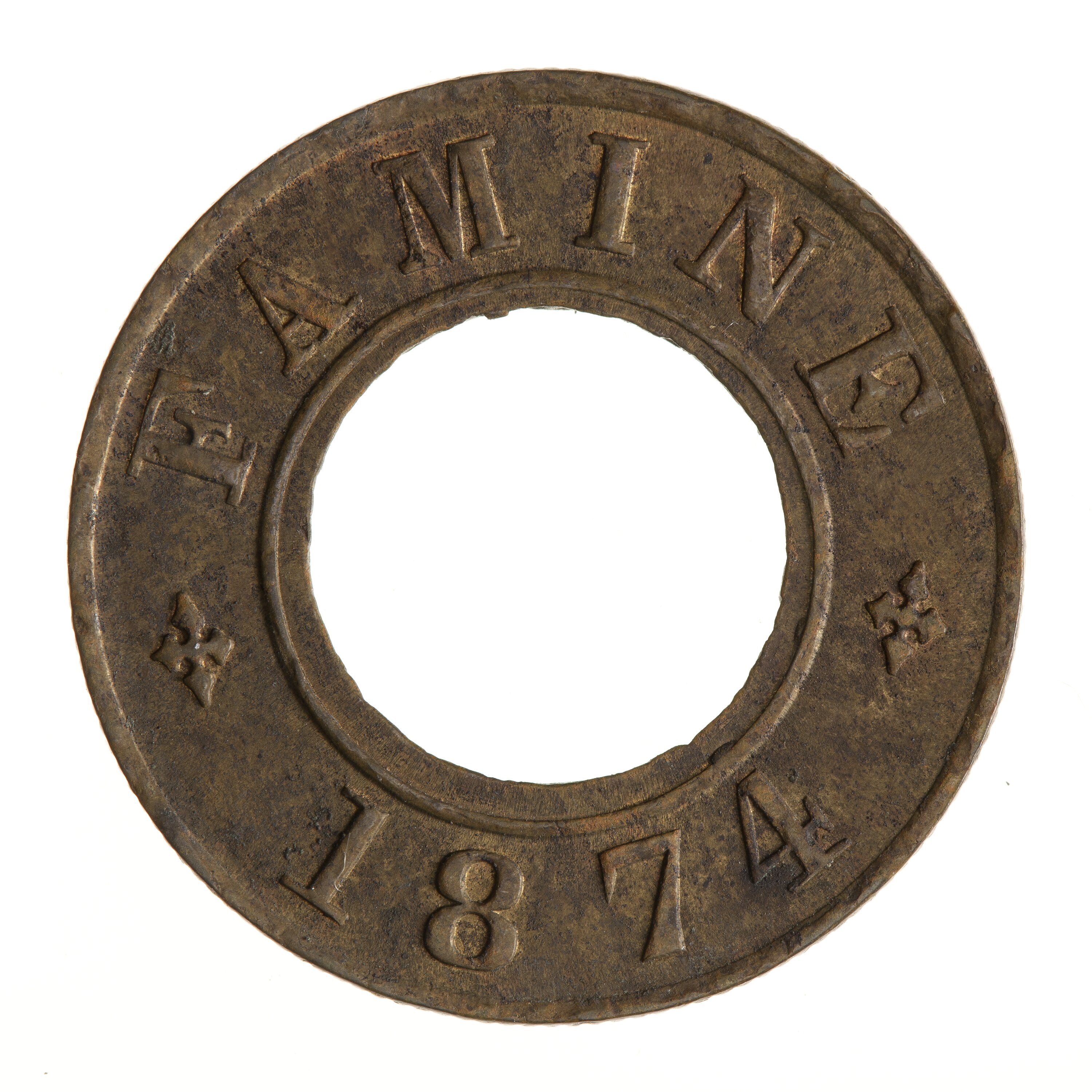 Pridmore states "A grain token struck at the Calcutta Mint for use on the Bengal famine relief works". The famine, also known as the Bihar famine 1873-1874, was caused by drought. Rice was imported from Burma for distribution.