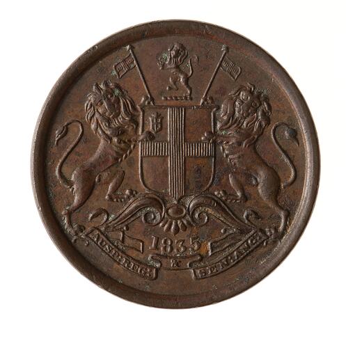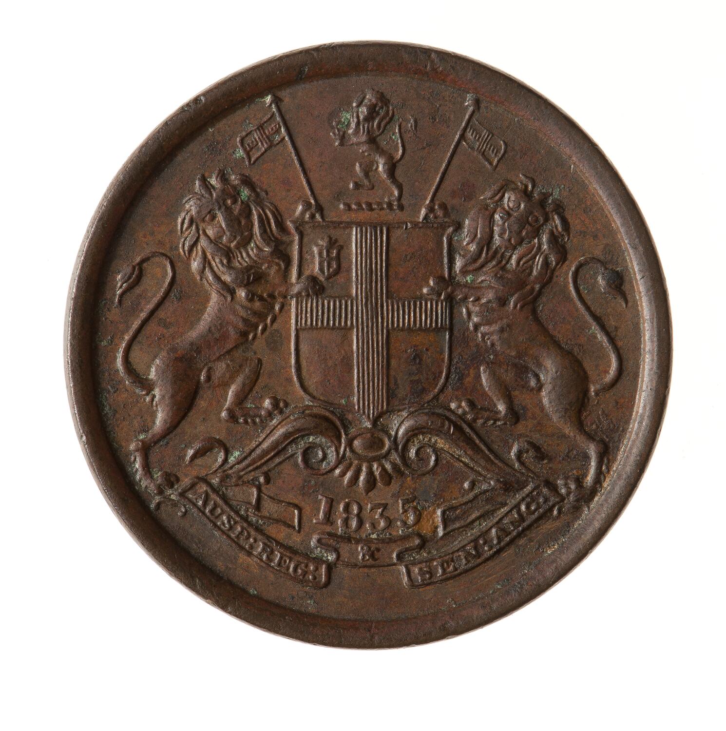 East India Company arms, a shield quartered with eschutcheon of France and England in the first quarter; crest of a lion rampant guardant holding between his forepaws the imperial crown proper; with supporters two lions rampant guardant each supporting a banner charged with a cross; below on a ribbon the motto, 'AUSP: REG: & SEN: ANG:' (translation: under the auspices of the king and senate of England); above ribbon, '1835'.