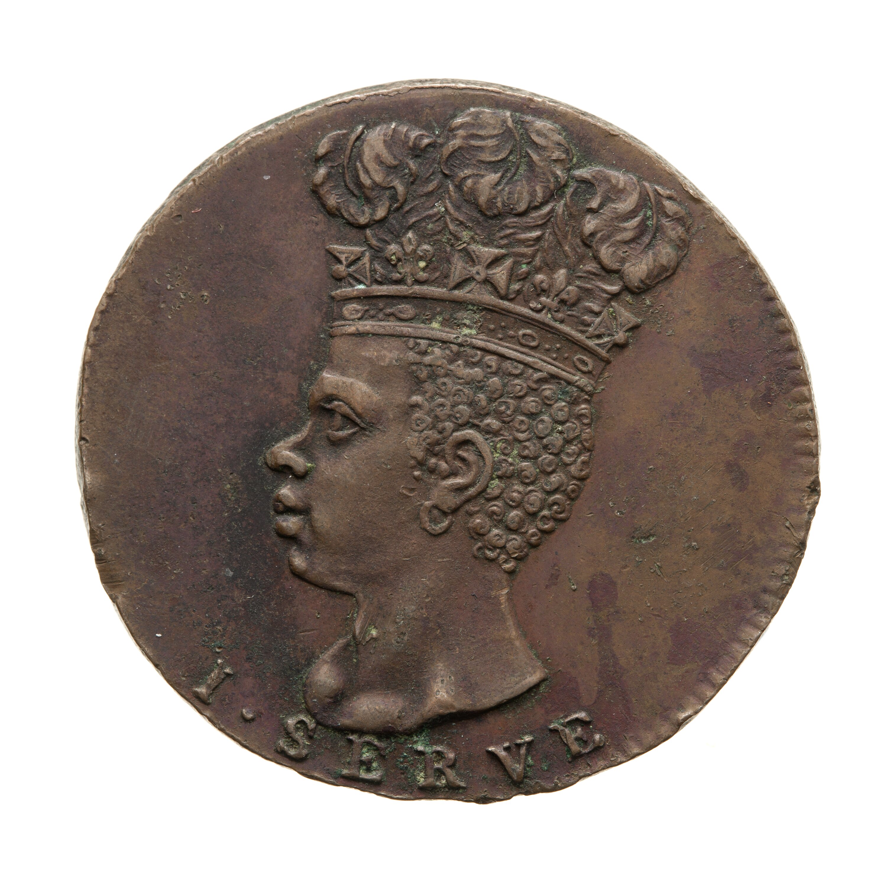 The head of a slave facing left, wearing a coronet and three feather plume; below, I SERVE; artist's initial, M, incuse on neck trucation.