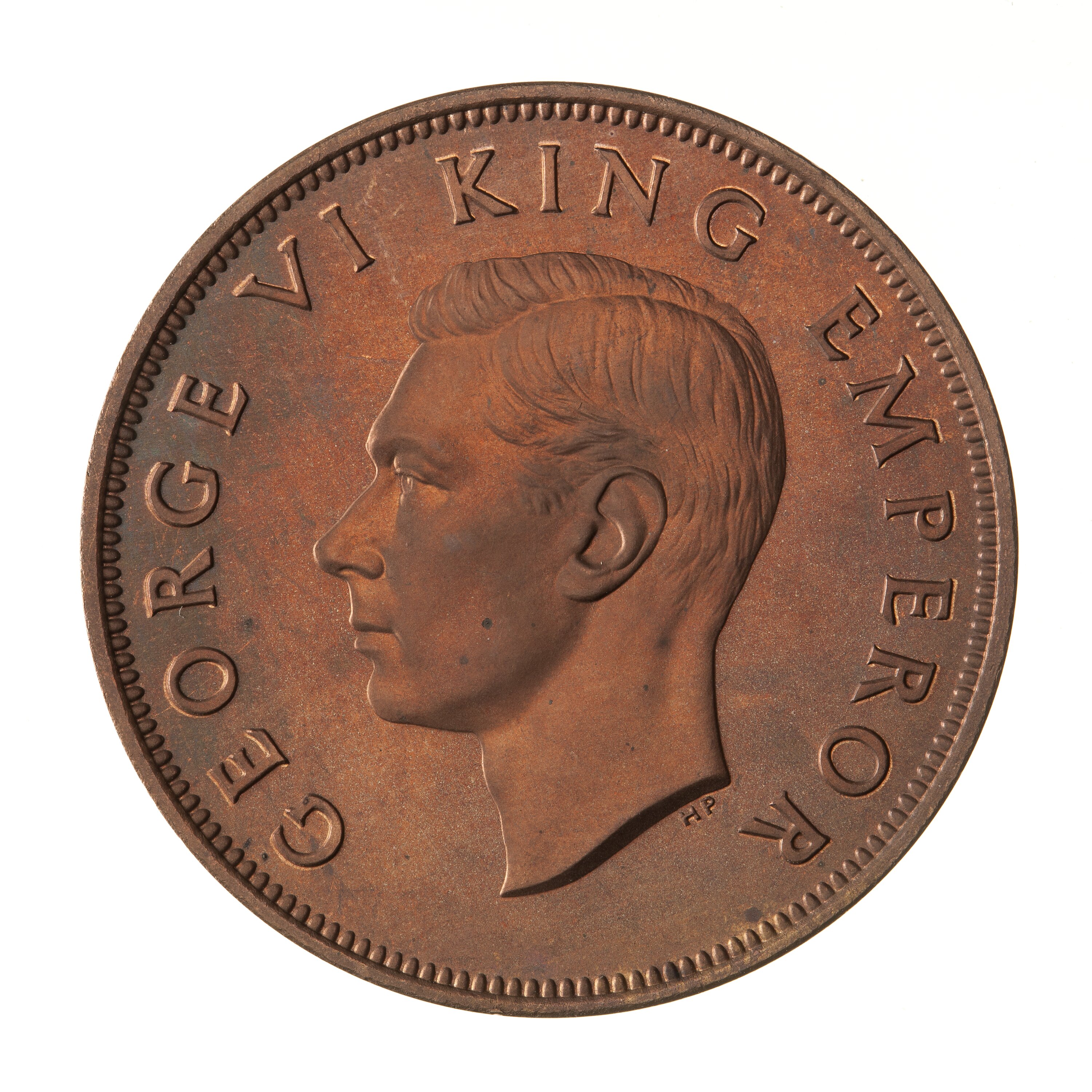 Bare head of the king facing left; around, GEORGE VI KING EMPEROR; below neck in small letters the artist's initials, HP (Humphrey Paget)