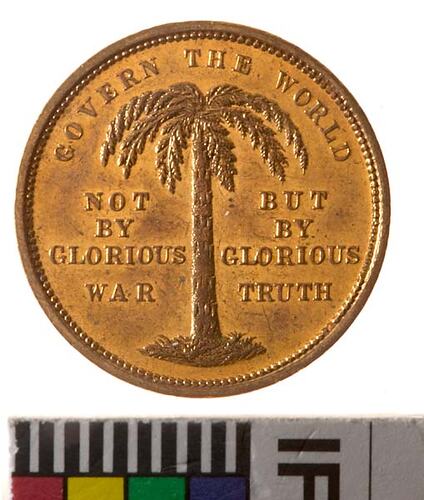 Medal, Cole's Book Arcade, Govern the World, circa 1875. This gilt medal is one of a series of medals offering maxims and proverbs issued by E.W. Cole at his Book Arcade. He called the medals 'little missionaries for the spread of educative knowledge' (Dean, 1988, p.36).