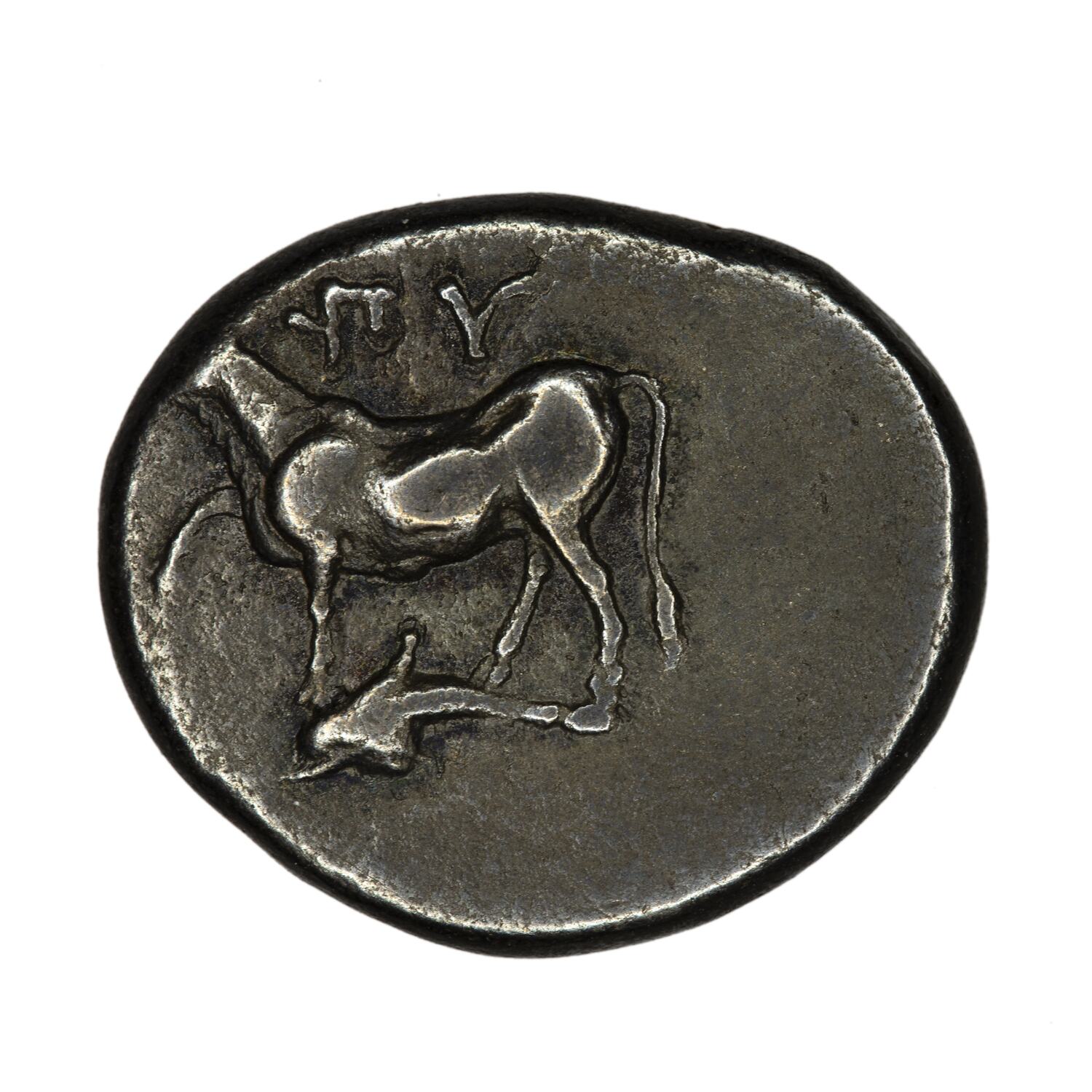 Bull advancing left; below, a dolphin; above, a monogram.