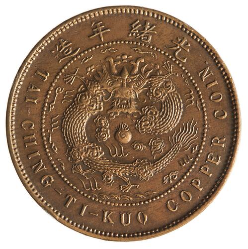 At centre, a dragon, facing; around below, TAI-CHING-TI-KUO COPPER COIN; around above, four Chinese characters