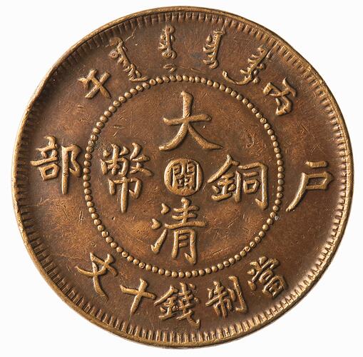 At centre, a raised circle with the Chinese mint character 'min' incuse, around within circle of beads four Chinese characters; around, outside circle of beads, 11 characters (those at left and right sides for Board of Revenue)