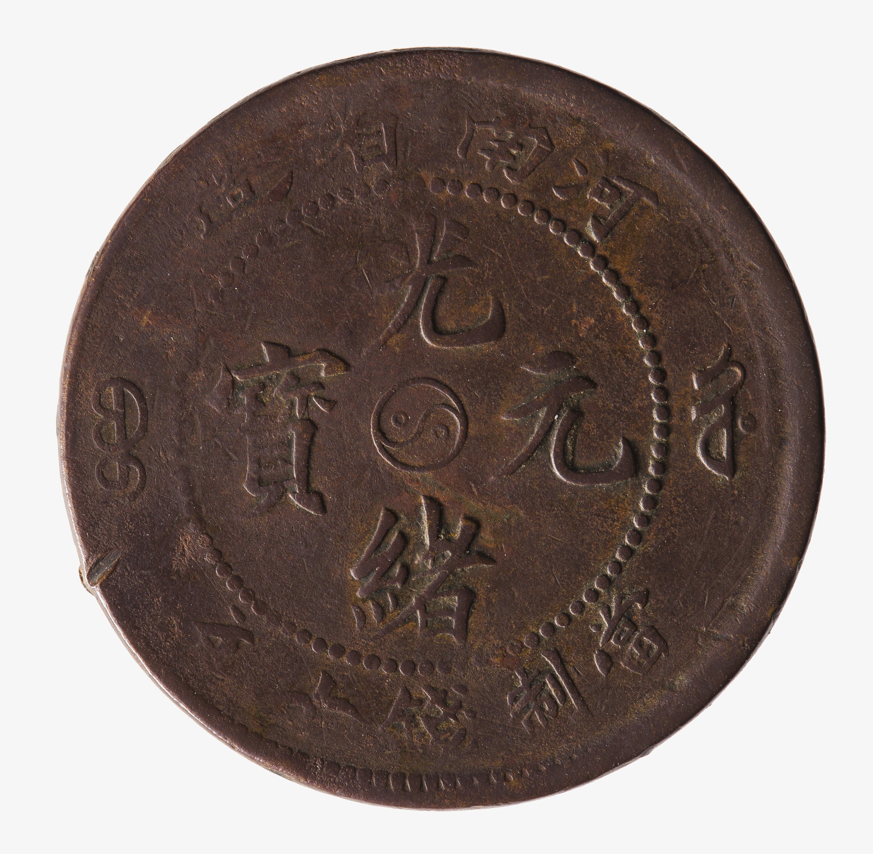 At centre, a raised yin-yang circle, around within circle of beads four Chinese characters; around, outside circle of beads, 11 characters