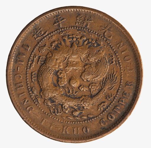 At centre within a circle of beads, a dragon, facing; around above, four Chinese characters; around below, TAI-CHING-TI-KUO COPPER COIN