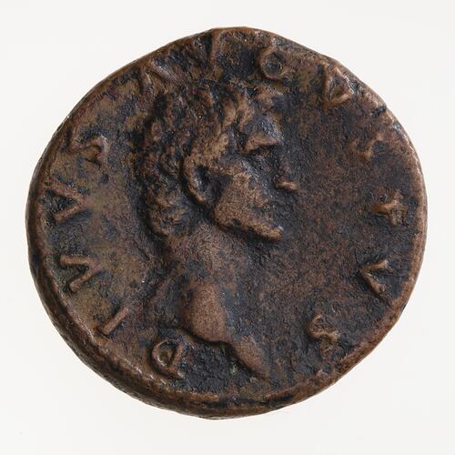 Copper As struck during the reign of the Emperor Nerva in the period 96 to 98 AD, Ancient Roman Empire. A restoration issue depicting the Emperor Augustus. Minted by Rome. Nerva had a range of coins commemorating the first Roman Emperor, Avgustus, produced. Recorded denominations of the "Divus Augustus" series are: denarius, sestertius, dupondius and as.