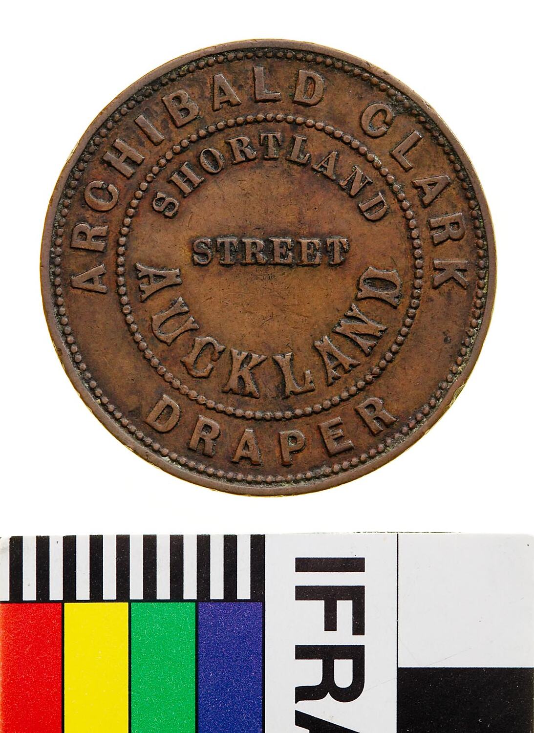 Obverse: ARCHIBALD CLARK SHORTLAND STREET AUCKLAND DRAPER Reverse: NEW ZEALAND 1857