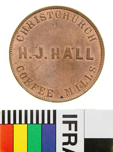 Obverse: H.J. HALL CHRISTCHURCH COFFEE MILLS Reverse: H.J. HALL FAMILY GROCER WINE & SPIRIT MERCHANT