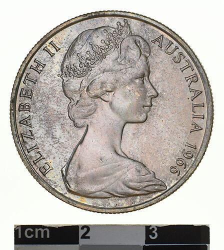 Diademed bust of Elizabeth II right; around, ELIZABETH II AUSTRALIA 1966