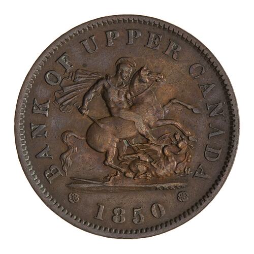 St. George on horseback facing right slaying a dragon with a sword; around above, BANK OF UPPER CANADA; in exergue between two roses, 1850; the letters R.K. & Co. on in the right side of the ground line represent the firm Row, Kentish & Co., London through whom the order for the production of the tokens had been placed.