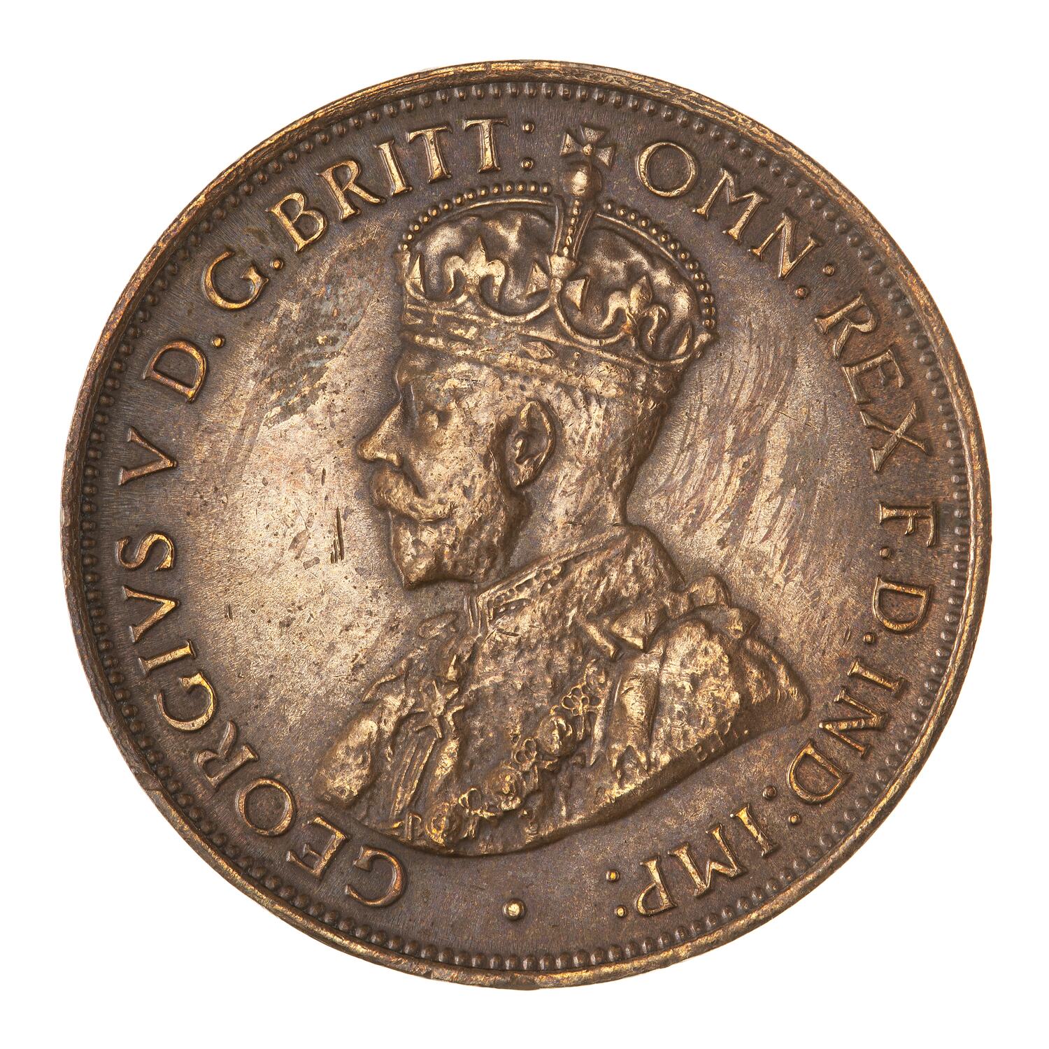 Crowned and draped bust of the King facing left, the King is wearing the Imperial Crown and the ermine Robe of State, the Collar of the Most Noble Order of the Garter, and the Badge of the Most Honourable Order of the Bath; around, GEORGIVS V D.G. BRITT: OMN: REX F.D. IND: IMP:; the artist's initials, BM, on the bust truncation