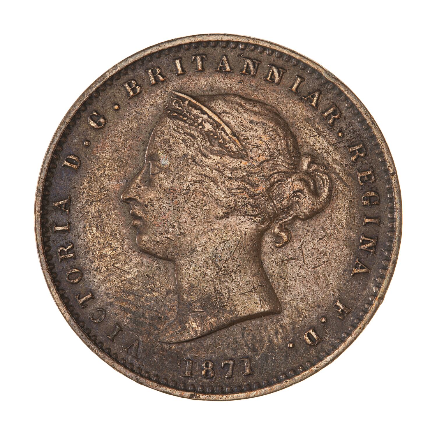 Head of the Queen facing left wearing coronet ornamented with oak leaves; around, VICTORIA D.G. BRITANNIAR. REGINA F.D.; below, 1871