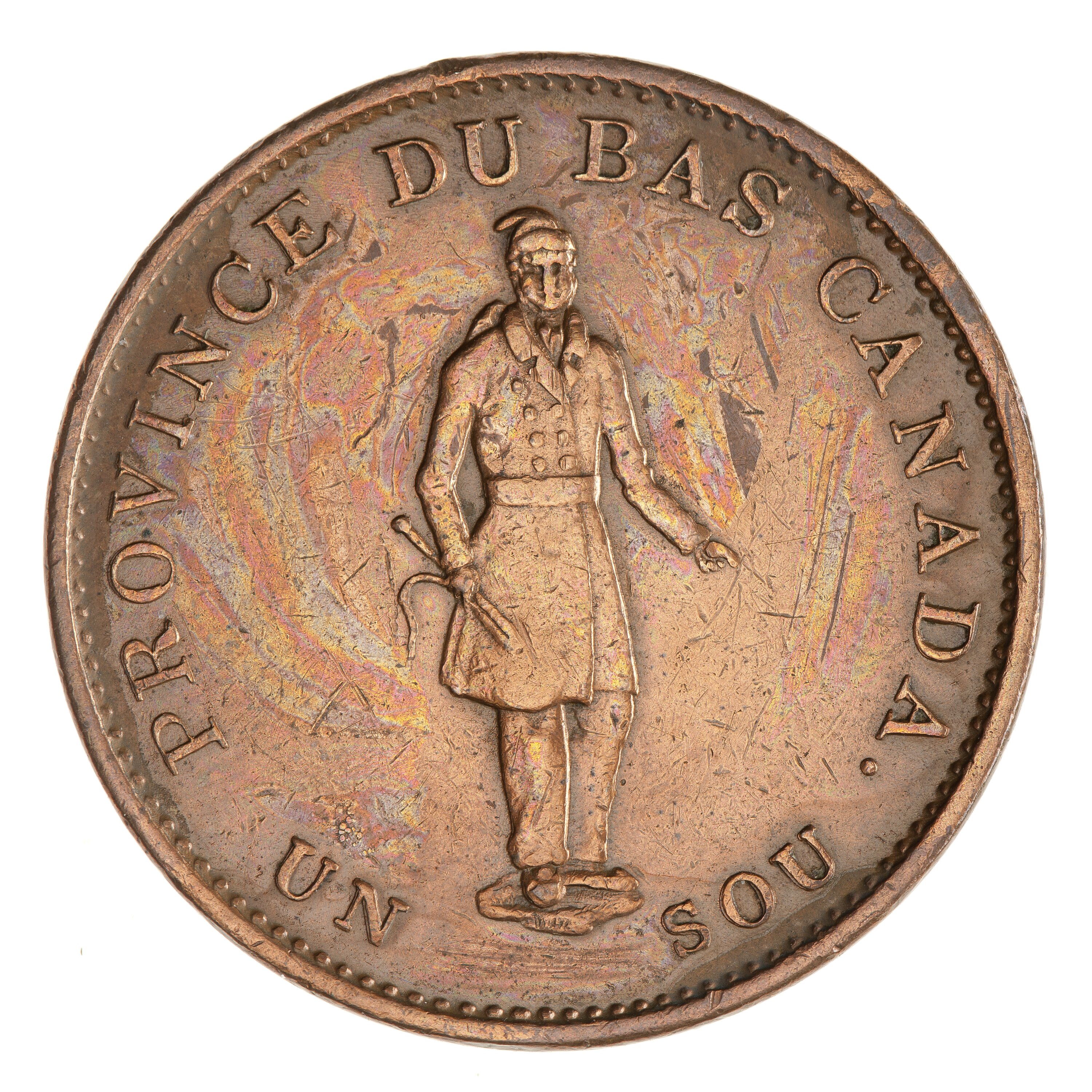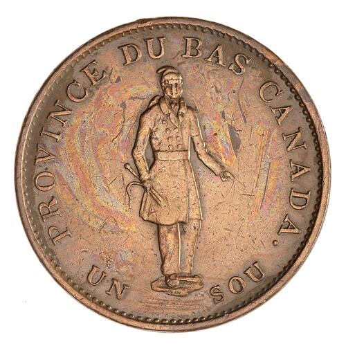 Habitant standing facing three-quarters right; around, PROVINCE DU BAS CANADA DEUX SOUS
