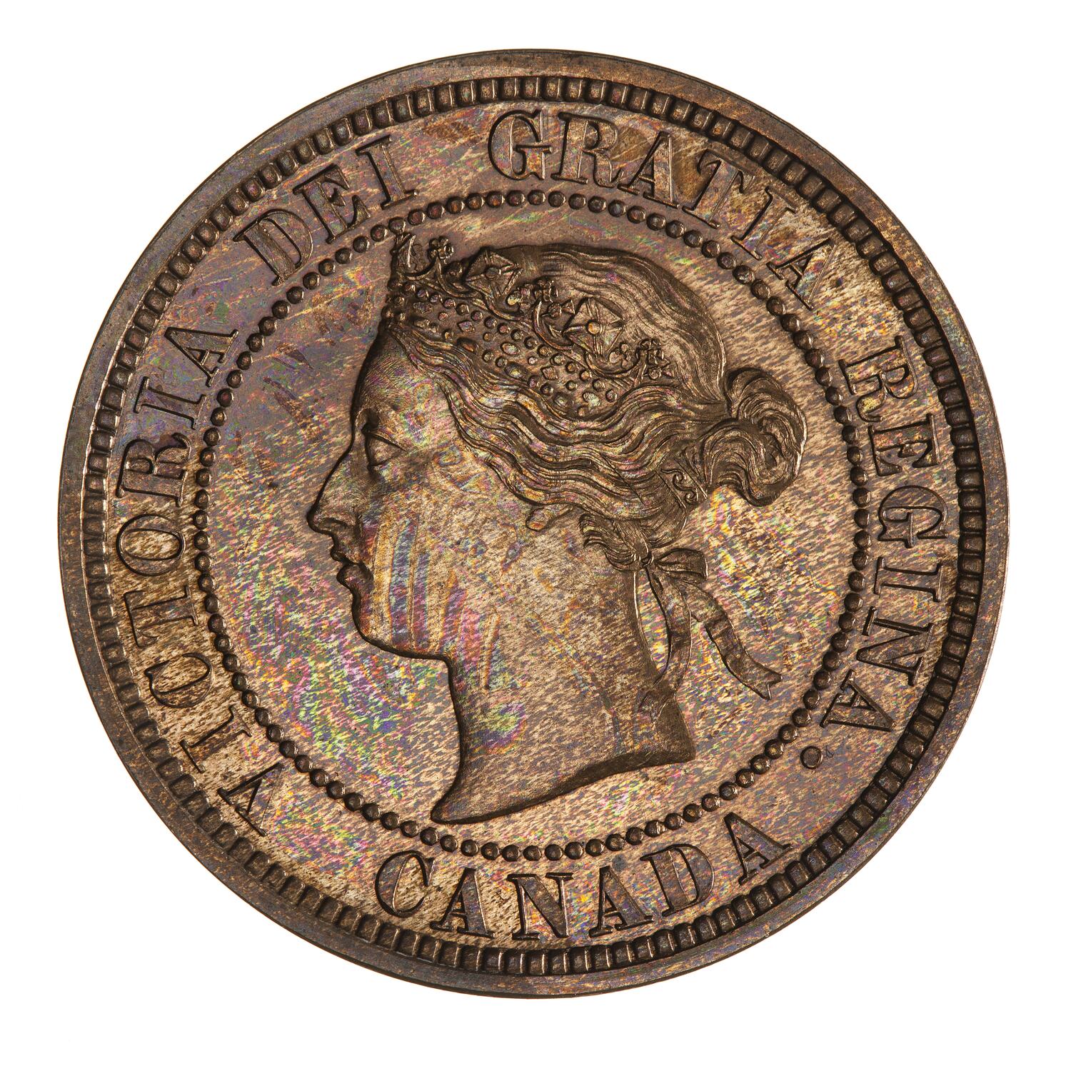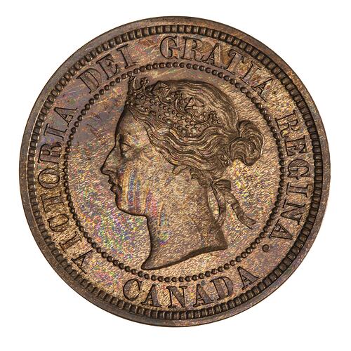 Within a beaded circle, head of the Queen facing left wearing coronet; around, VICTORIA DEI GRATIA REGINA; below, CANADA