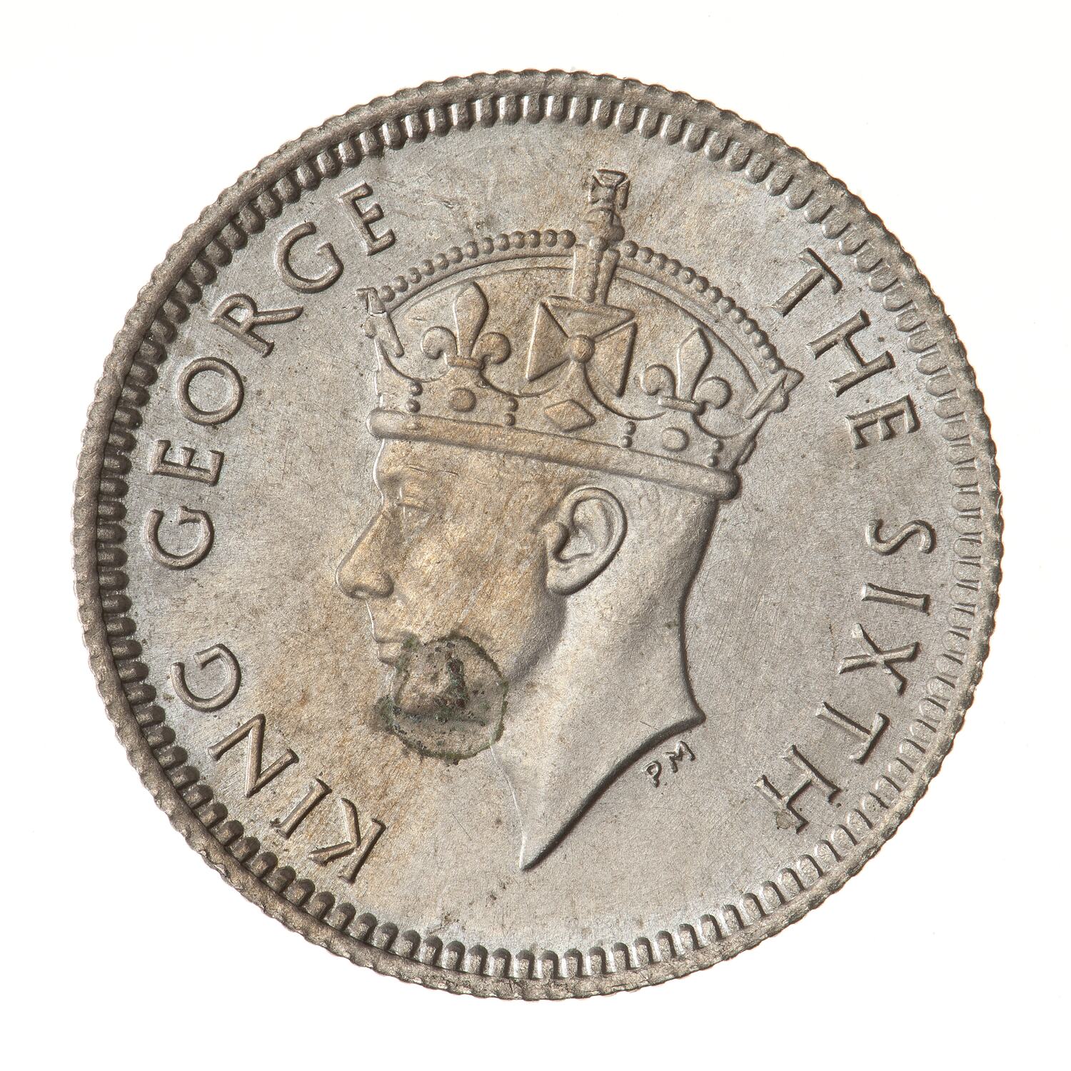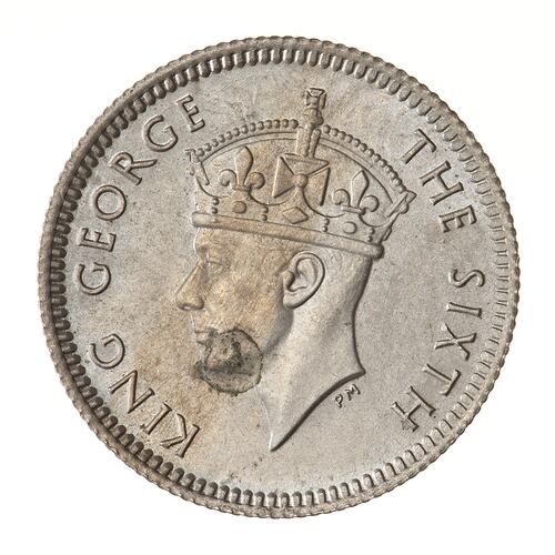 This 1948 coinage marked the move from silver to Copper-Nickel alloy (75% copper, 25% nickel). These coins entered circulation after the Governor's Regulation was passed on 24 August 1948. The obverse legend reflects Indian Independence which was achieved in 1947 with the term Emperor (or more fully Emperor of India) is omitted.