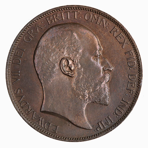 Bare head of the King facing right; below in small letters De S. (for G.W. De Saulles Mint Engraver); around, EDWARDVS VII DEI GRA: BRITT: OMN: REX FID: DEF: IND: IMP: