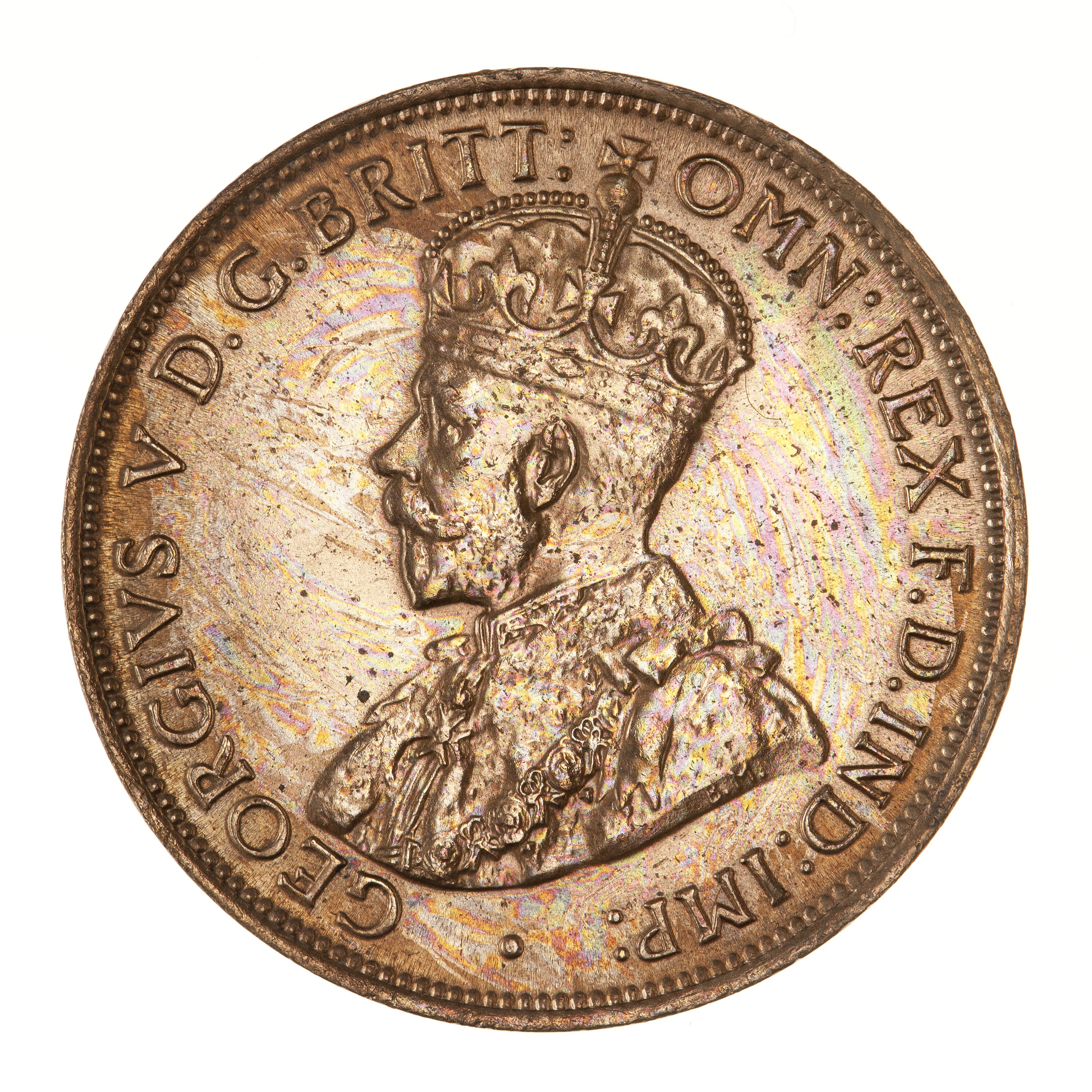 Crowned and draped bust of the King facing left; around, GEORGIVS V D.G. BRITT: OMN: REX F.D. IND: IMP:; the artist's initials, BM, on the bust truncation