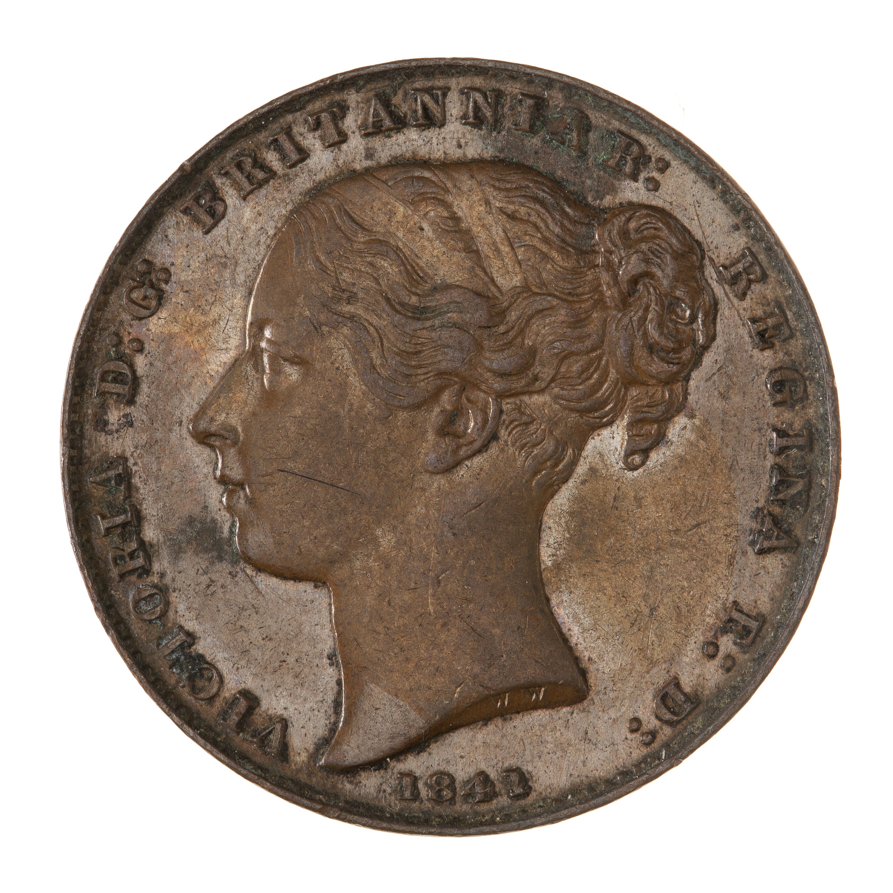 Head of the Queen facing left wearing plain fillet in hair; around, VICTORIA D:G: BRITANNIAR: REGINA F:D:; below, 1841; the artist's initials, WW, incuse on neck truncation