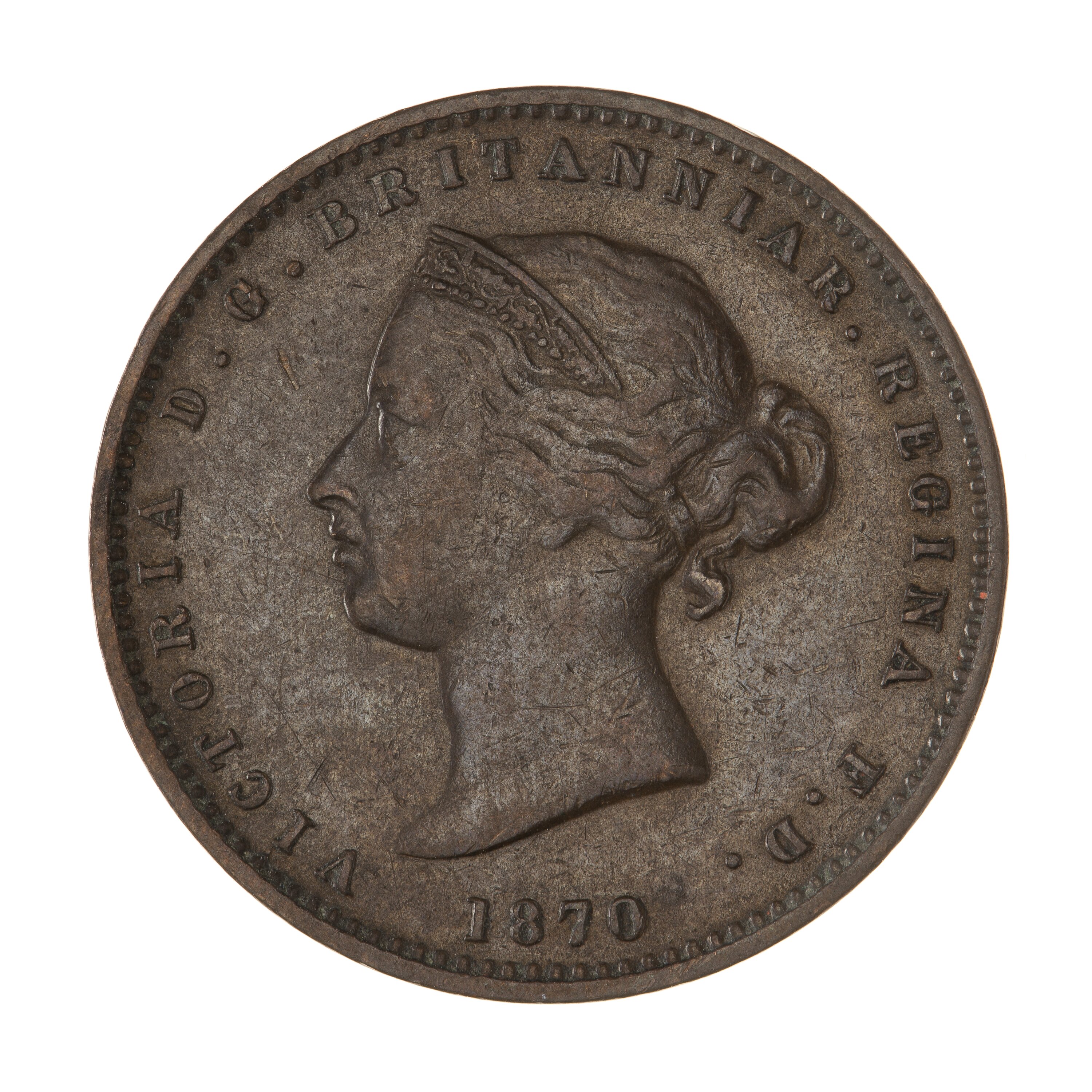 Head of the Queen facing left wearing coronet ornamented with oak leaves; around, VICTORIA D.G. BRITANNIAR. REGINA F.D.; below, 1870