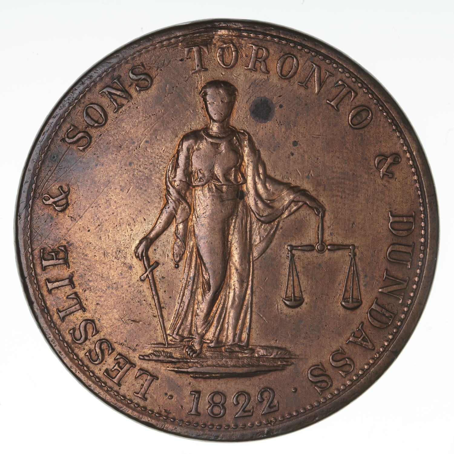Justice standing facing holding scales in her left hand and resting a sword, point down, in her right; around, LESSIE & SONS TORONTO & DUNDASS 1822