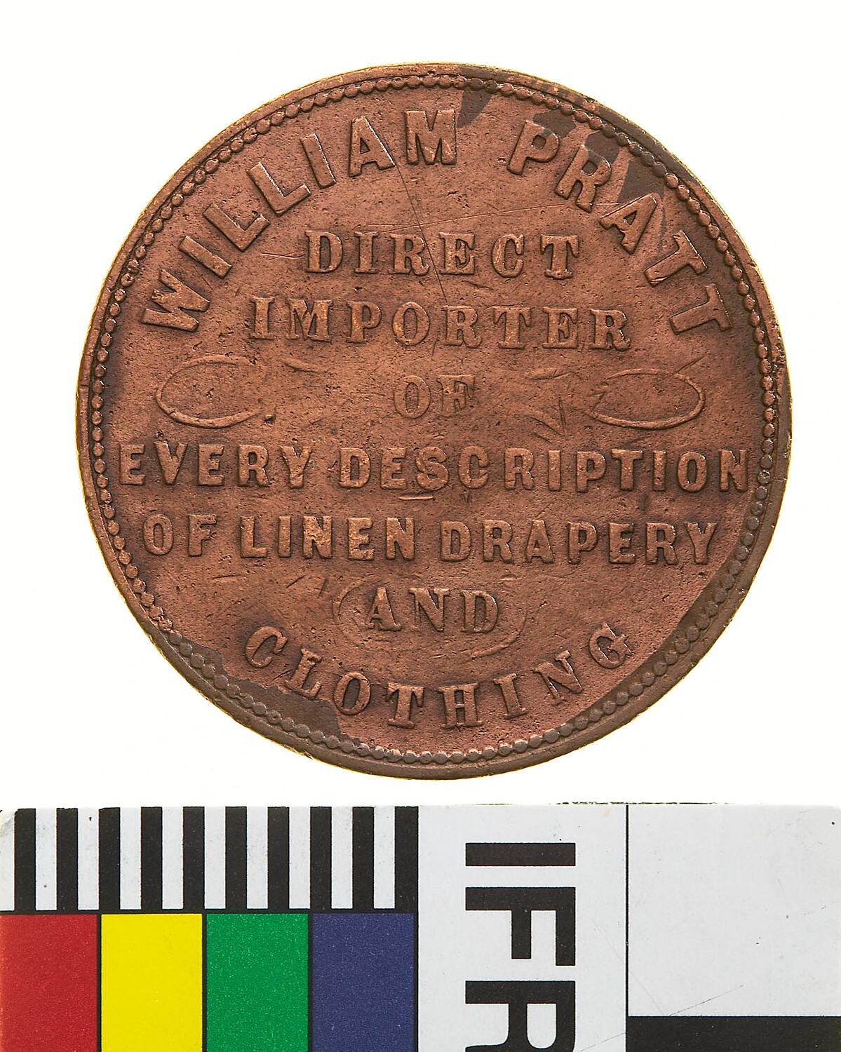 A round copper token (34 mm diameter) giving the name address and business of the issuer: W. Pratt Dunsrable House, Cashel Street Christchurch, importer of linen drapery and clothing. It gives the date of the foundation of the firm, 1854. This token has been cleaned and varnished.