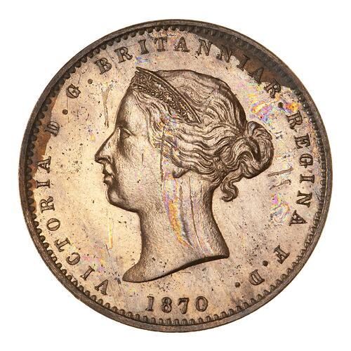 Head of the Queen facing left wearing coronet ornamented with oak leaves; around, VICTORIA D:G: BRITANNIAR: REGINA F:D:; below, 1870