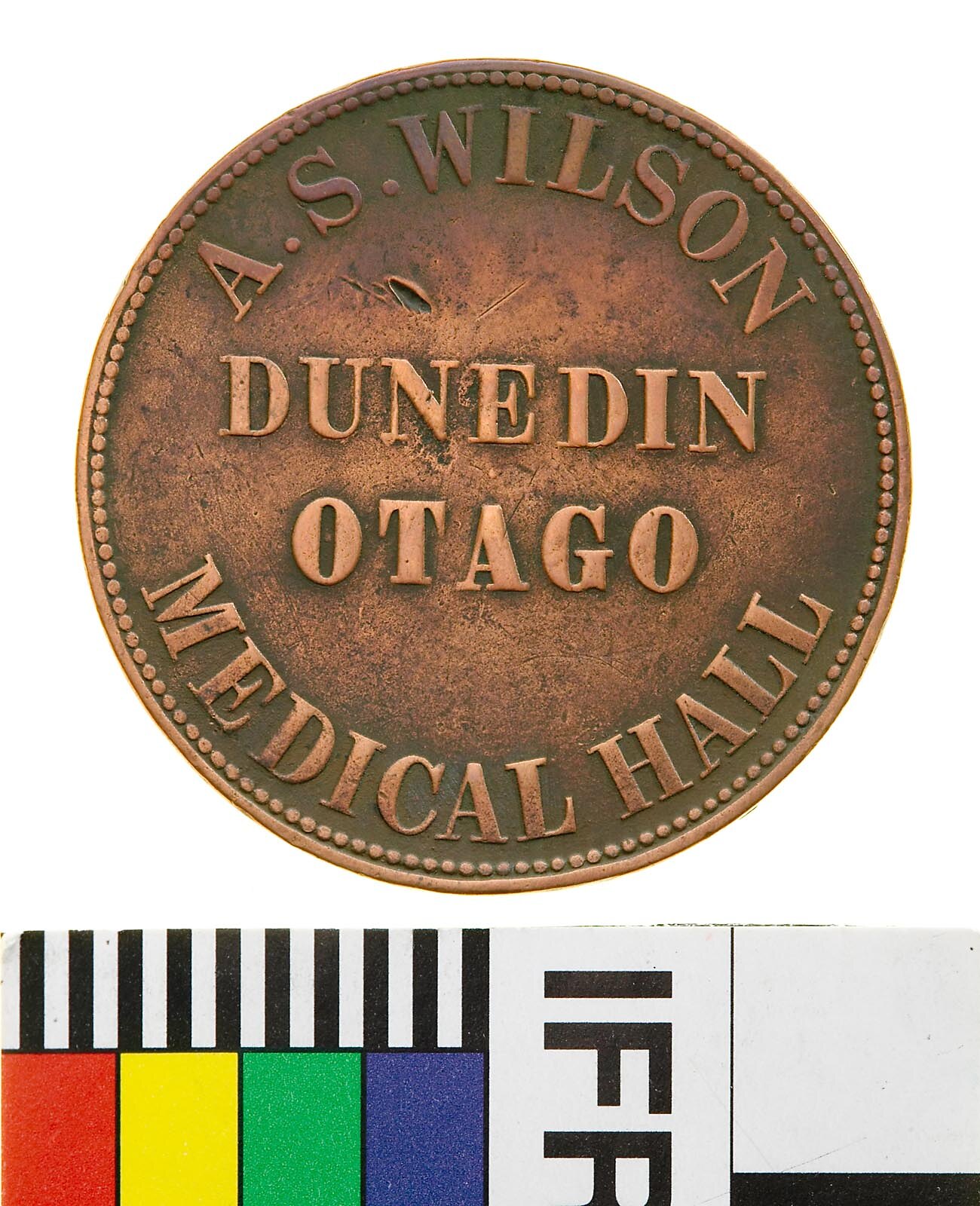Copper One Penny Token, minted by W.J. Taylor, London. Issued by A.S. Wilson, Chemist, Dunedin, 1857. Andrew Smith Wilson established a chemist's business in Dunedin under the name 'Medical Hall' in 1852, having recently arrived from Scotland. In 1863 he sold his business to Messrs. Wilkinson and Dixon. so he could work for worked for Reynolds & Co., Aerated water manufacturers. He is also said to have been one of the first photographers in Dunedin and is credited with having taken the first photograph of the town.