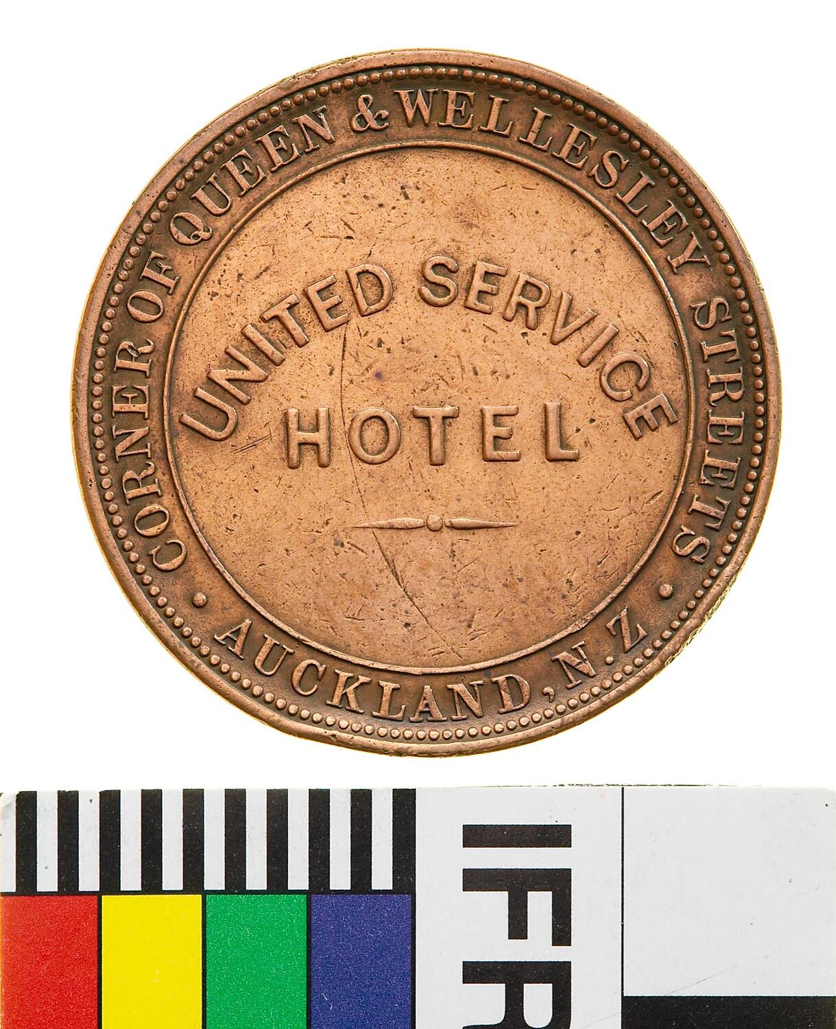 Obverse: UNITED SERVICE HOTEL CORNER QUEEN & WELLESLEY STREETS AUCKLAND N.Z. Reverse: VICTORIA DEI GRATIA 1874