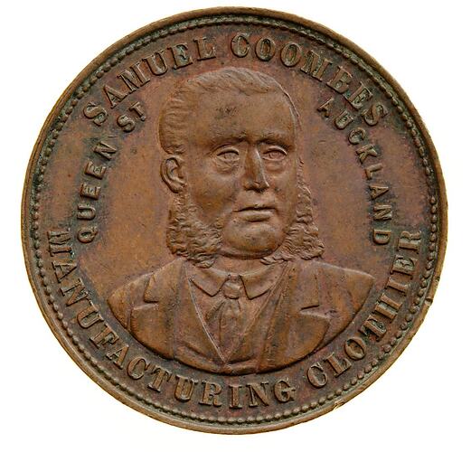 A round copper token (34 mm diameter) featuring the name, address and business of the company that issued the tokens: Samuel Coombes, Queen Street Auckland and Albert Street Graham Town, tailor, manufacturing clothier, mercer. The obverse features a bust of Coombes. The reverse has been cleaned.