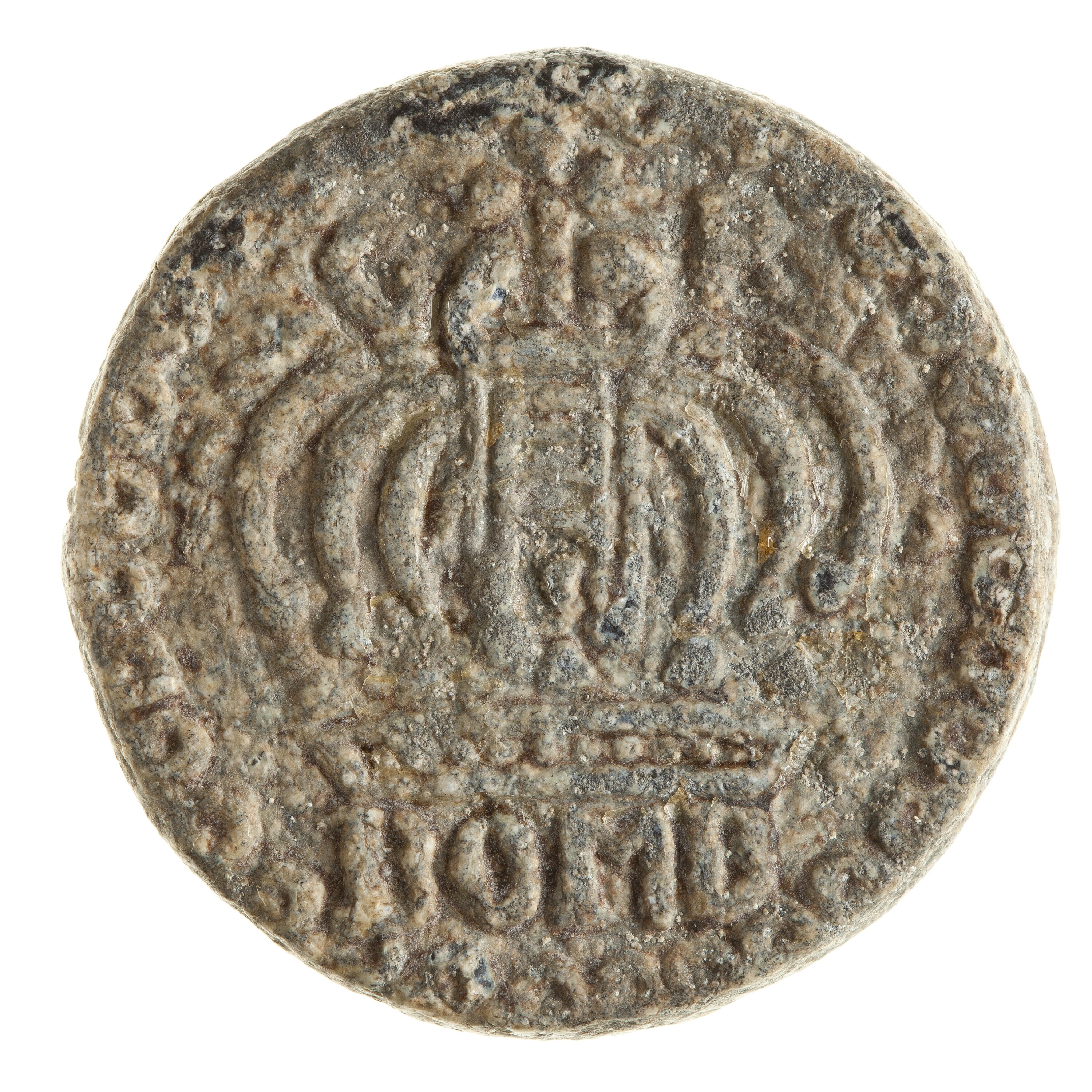 A large crown; above, divided by the cross and orb on top of the crowm, CR; below, BOMB