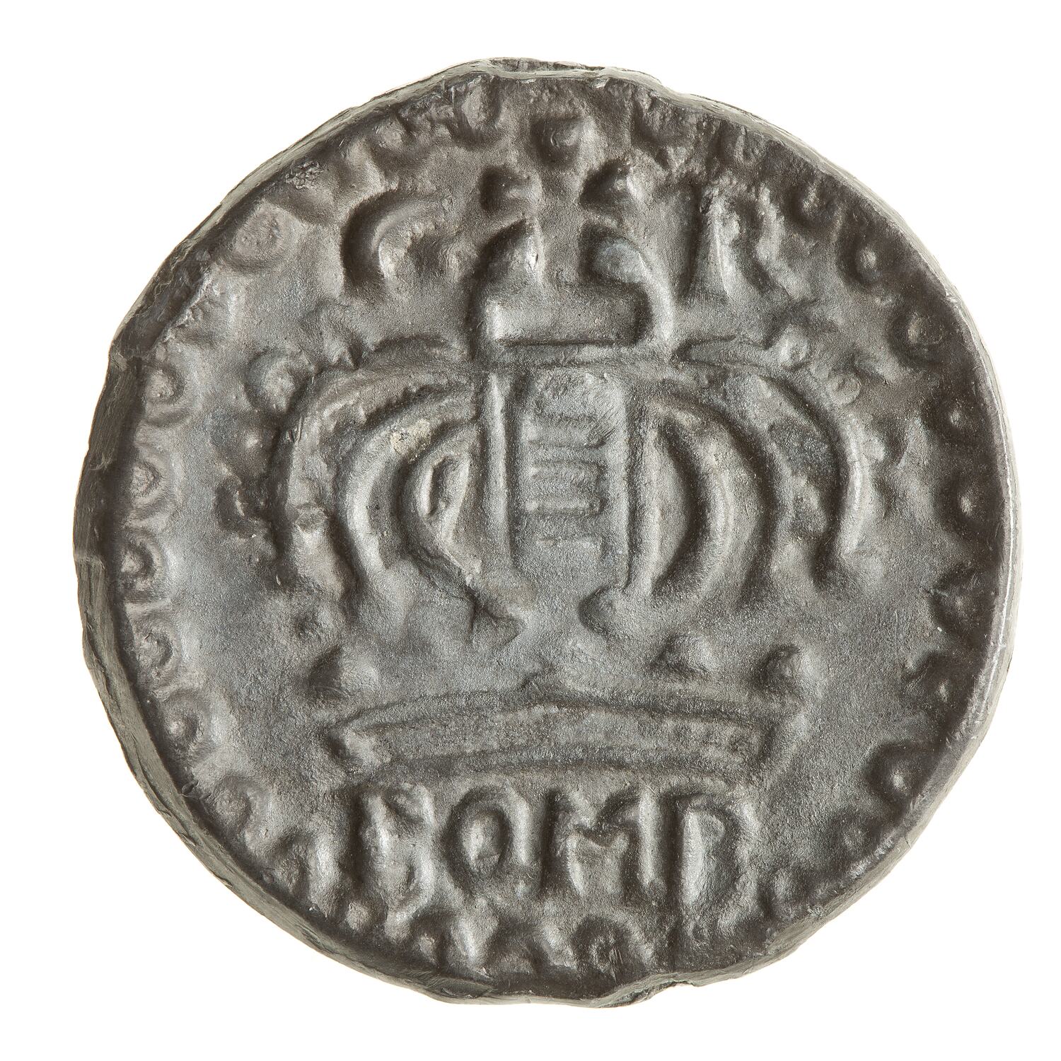 A large crown; above, divided by the cross and orb on top of the crowm, CR; below, BOMB