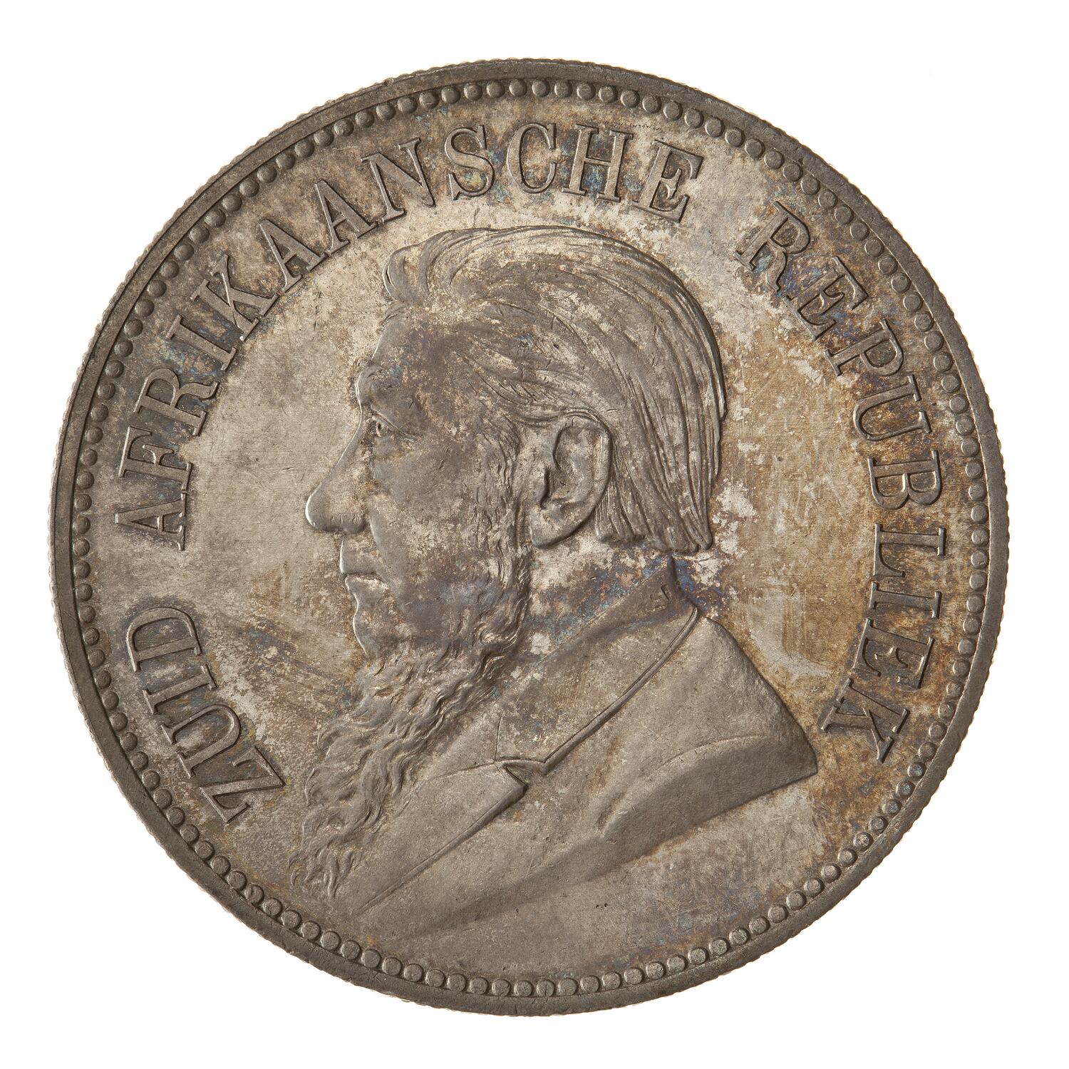 The first issue of ZAR coins was struck in Berlin in order that they would be available in South Africa in time for Presidential elections in 1892. However the German engraver depicted the incorrect form of wagon in the arms on the reverse, the correct form had a single shaft and larger back wheels than those on the front. The National Bank of the Zuid-Afrikaansche Republiek established its own mint on 6 July 1892 and corrected this error, striking coins like this example with a single shaft and larger back wheels.