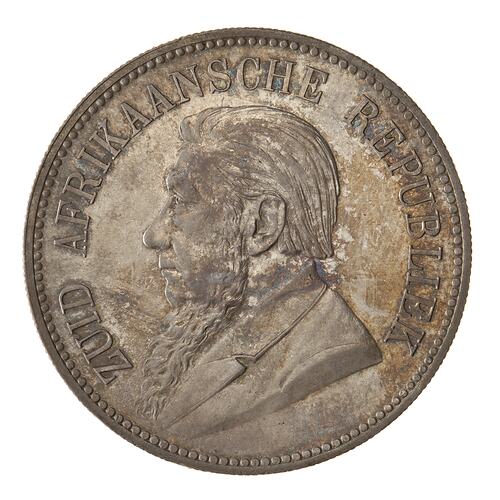 Draped bust of Paulus Kruger facing left; around, ZUID AFRIKAANSCHE REPUBLIEK
