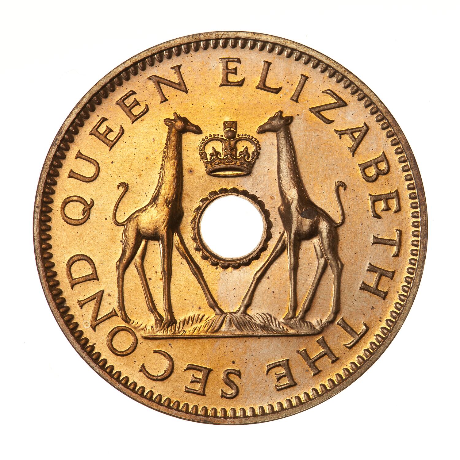 At sides of central hole two Giraffe standing facing each other with their heads on either side of a crown; around, QUEEN ELIZABETH THE SECOND