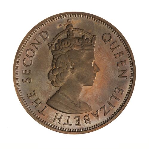 Crowned bust of the queen facing right; around, QUEEN ELIZABETH THE SECOND; artist's initials, CT, incuse on bust truncation
