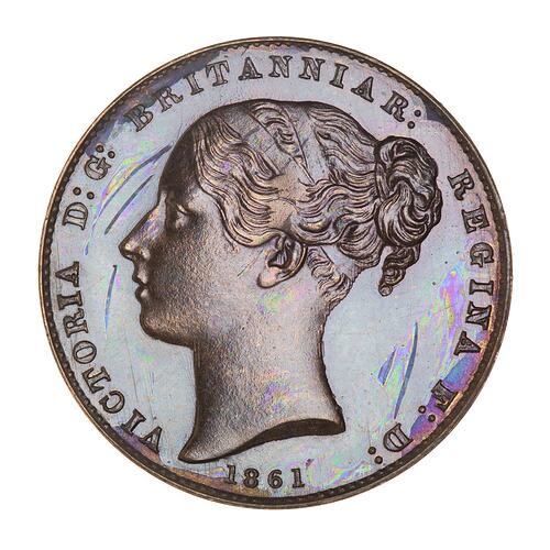 Young head of the Queen facing left wearing ornamented band in her hair; around, VICTORIA D: G: BRITANNIAR: REGINA F: D:; below, 1861; artist's initials, W.W., incuse on neck truncation