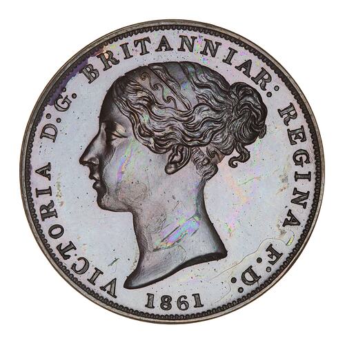 Young head of the Queen facing left wearing ornamented band in her hair; around, VICTORIA D: G: BRITANNIAR: REGINA F: D:; below, 1861; artist's initials, W.W., incuse on neck truncation
