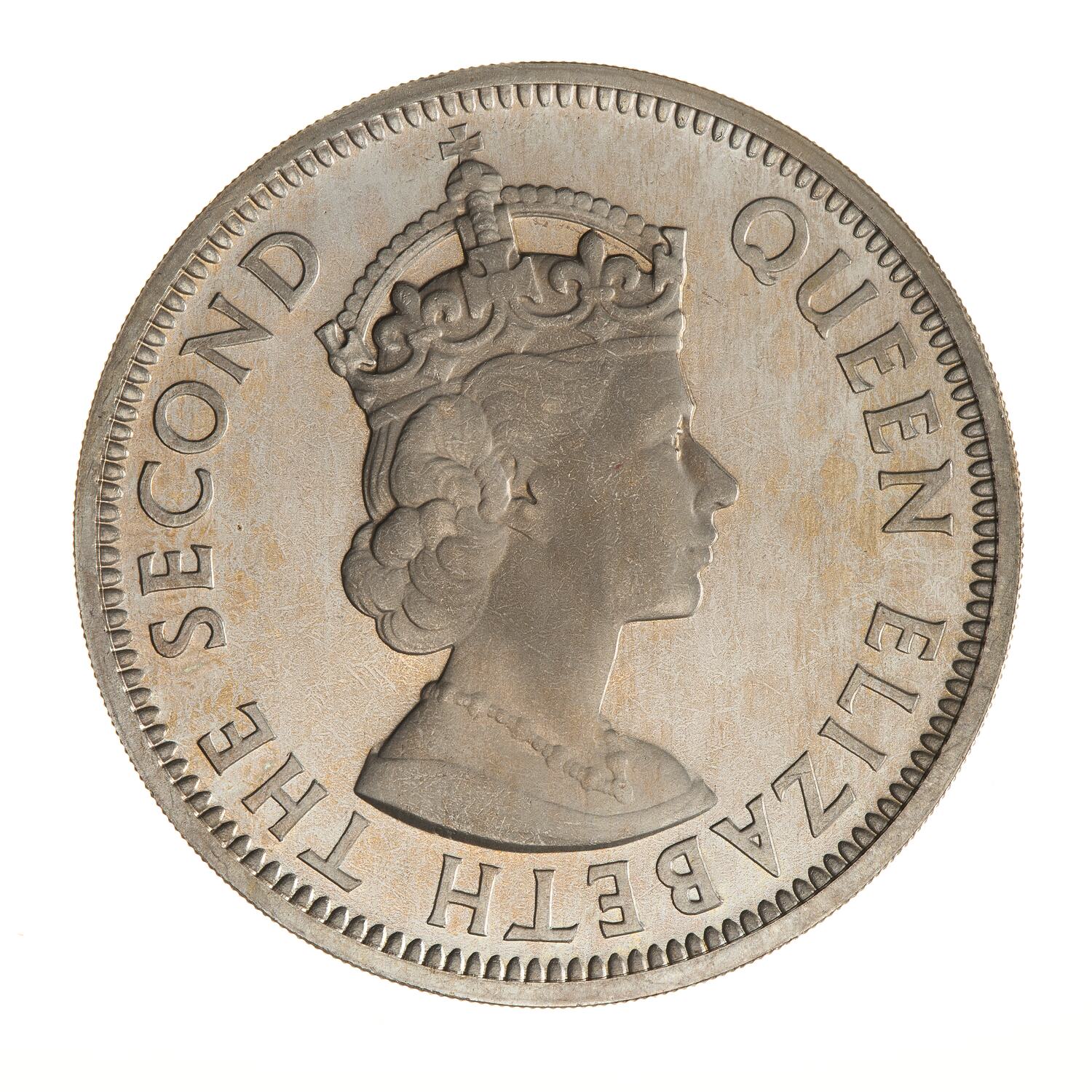 Crowned bust of the queen facing right; around, QUEEN ELIZABETH THE SECOND; artist's initials, CT, incuse on bust truncation